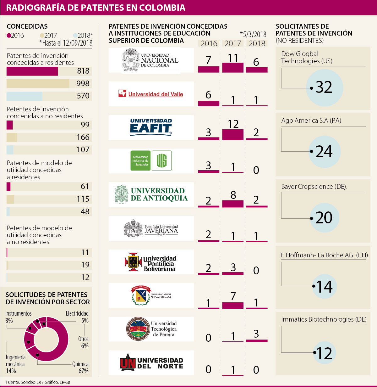Un buen indicador es que las universidades lideran el ranking de solicitudes de patentes ante la Superintendencia de Industria y Comercio, hecho que se fundamenta en el crecimiento acelerado que se ha tenido los últimos periodos en cuanto a innovación se refiere. En lo que va corrido de 2018, la SIC ha concedido un total de 20 patentes a varias instituciones educativas en Colombia. Se distribuyen en los siguientes sectores: nueve en mecánica; cinco en electricidad, electrónica y telecomunicaciones; tres en procesos químicos; y tres en productos biológicos.