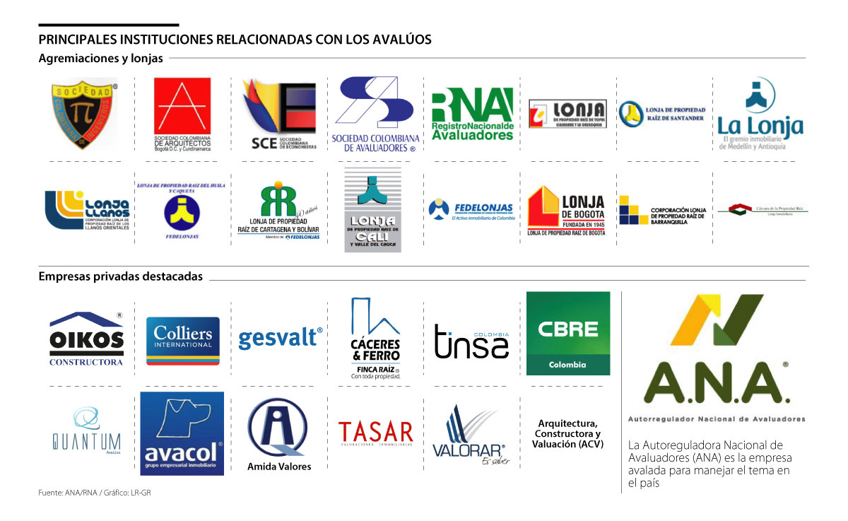 Por el lado de las empresas privadas, algunas de las más destacadas son Oikos, Colliers International, Tinsa, Tasar o Avacol, entre otras (ver gráfico). Los procesos en los que se especializan estas firmas se centran en el avalúo de inmuebles como casas, apartamentos, edificios, oficinas, locales comerciales, terrenos y bodegas tanto urbanos como rurales.