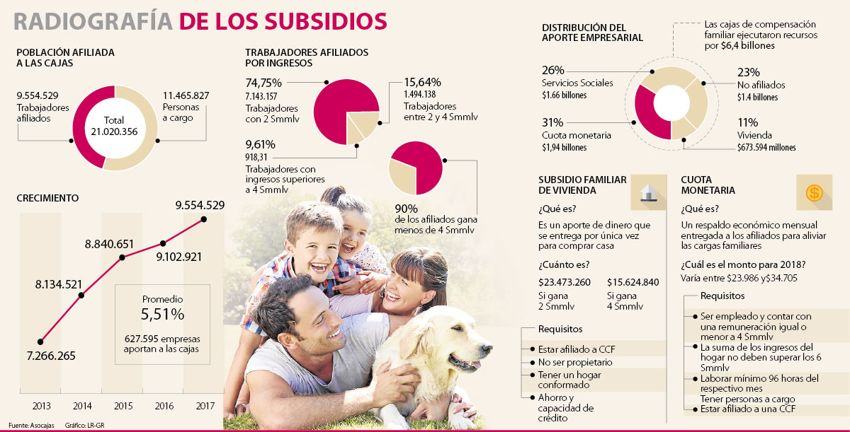 Durante 2017, las cajas de compensación del país entregaron $1,9 billones en cuota monetaria. Para este año, de acuerdo con la Superintendencia, se espera llegar a los $2 billones. El subsidio es un respaldo económico mensual que entregan las CCF a los trabajadores, cuya remuneración es menor o igual a cuatro Smmlv. Para recibirlo debe ser una persona que tenga a cargo hijos menores de 18 años, hermanos huérfanos de padres que dependan del trabajador o padres mayores de 60 años que no tienen ningún ingreso.