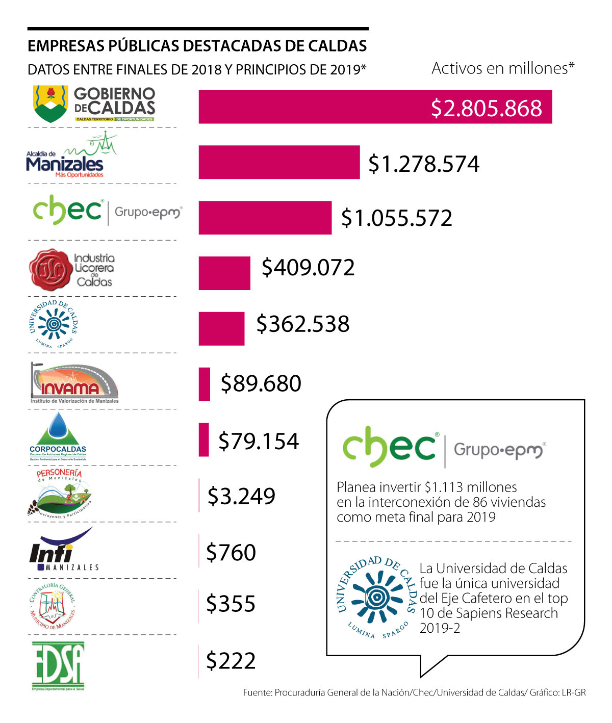 Al margen de las instituciones gubernamentales como la Gobernación y la Alcaldía, empresas como la Central Hidroeléctrica de Caldas (Chec), la Industria Licorera de Caldas (ILC) y la Universidad de Caldas destacan como las compañías públicas más relevantes para el departamento a nivel nacional debido a sus inversiones en materia de interconexión y su excelencia académica.