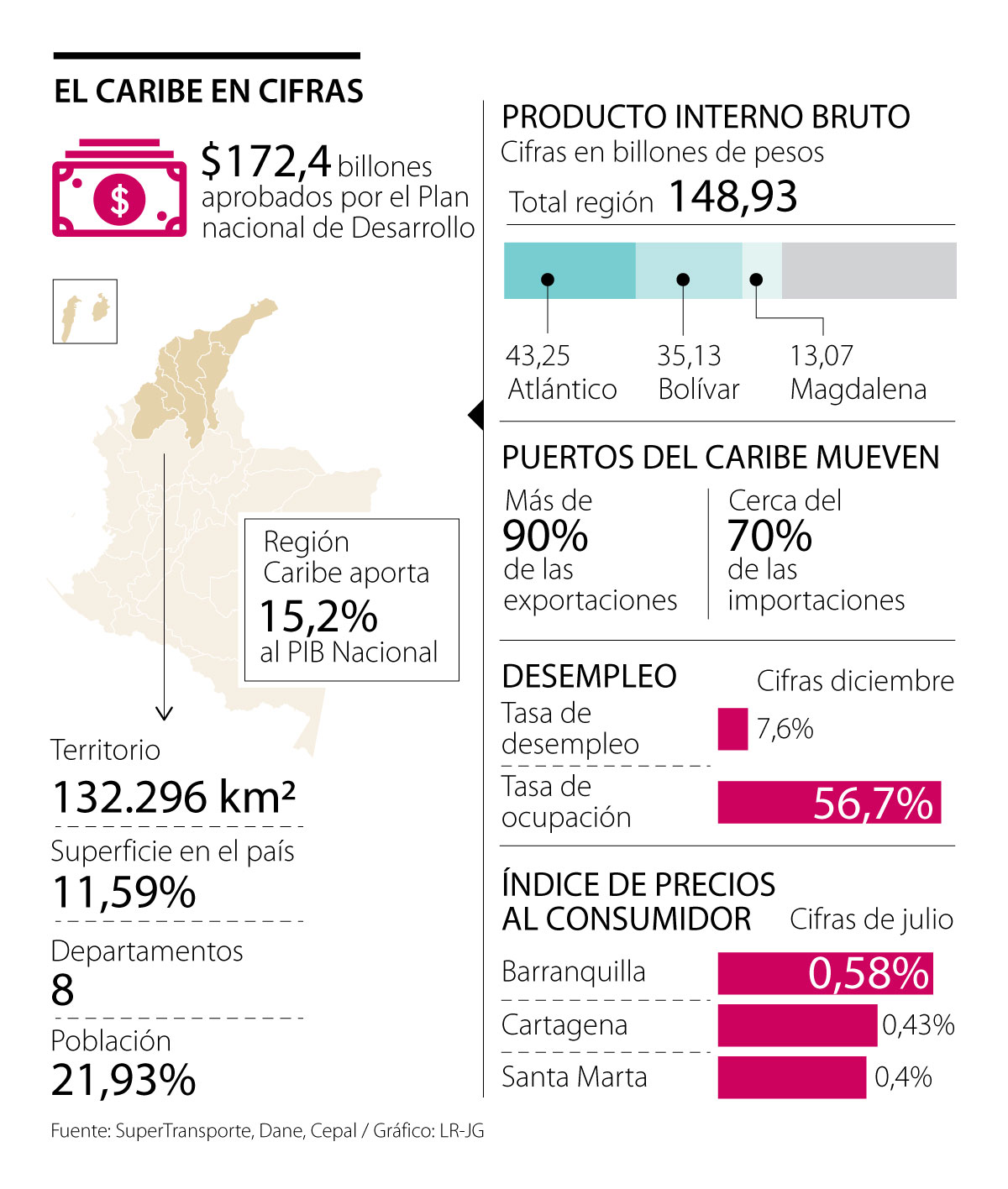 El Gobierno Nacional aprobó $172,4 billones para ser invertidos en la región en el Plan nacional de Desarrollo. Los rubros que más inciden en la economía del Caribe colombiano son los puertos, la agricultura y el turismo, este último tuvo un crecimiento de 4,7% en el Atlántico en mayo, según Cotelco.