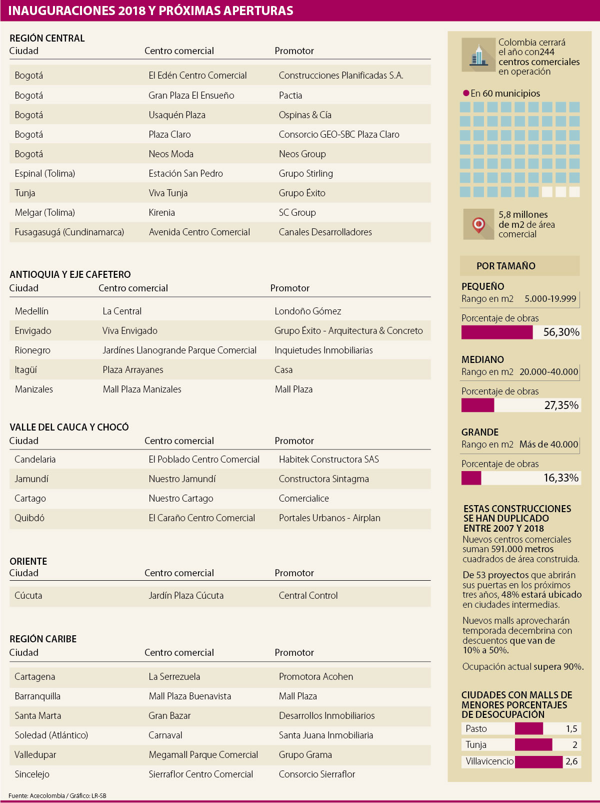 El boom de los nuevos centros comerciales recibió un gran impulso en 2018 con la inauguración de obras de alto nivel como Viva Envigado, La Central, Plaza Claro, Jardín Plaza Cúcuta, Mallplaza Manizales, Viva Tunja y Gran Plaza El Ensueño, entre otros, que con los demás malls comerciales en 60 municipios del país completarán 244 establecimientos de este tipo en funcionamiento.