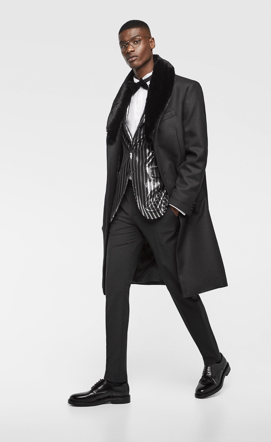 Los hombres no quedan olvidados en esta selección. Zara considera que el satinado, velvetón y lentejuela también tendrán presencia en la moda masculina. Predominarán en las colecciones, puntualiza, las estampaciones heráldicas, negros y colores dorados.