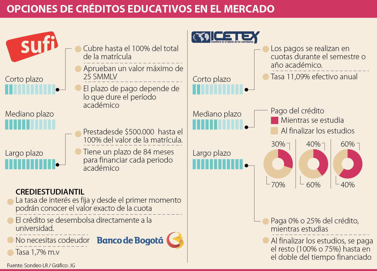 Por ejemplo, el Banco de Bogotá brinda alternativas de financiación para acceder a programas tecnológicos, pregrados y posgrados, a través de su línea Crediestudiantil, que puede financiar hasta 100% de la matrícula. Los plazos se adaptan al ciclo de estudio, lo que mejora el flujo de caja de quienes adquieren el crédito. La tasa de interés es de 1,7% MV.