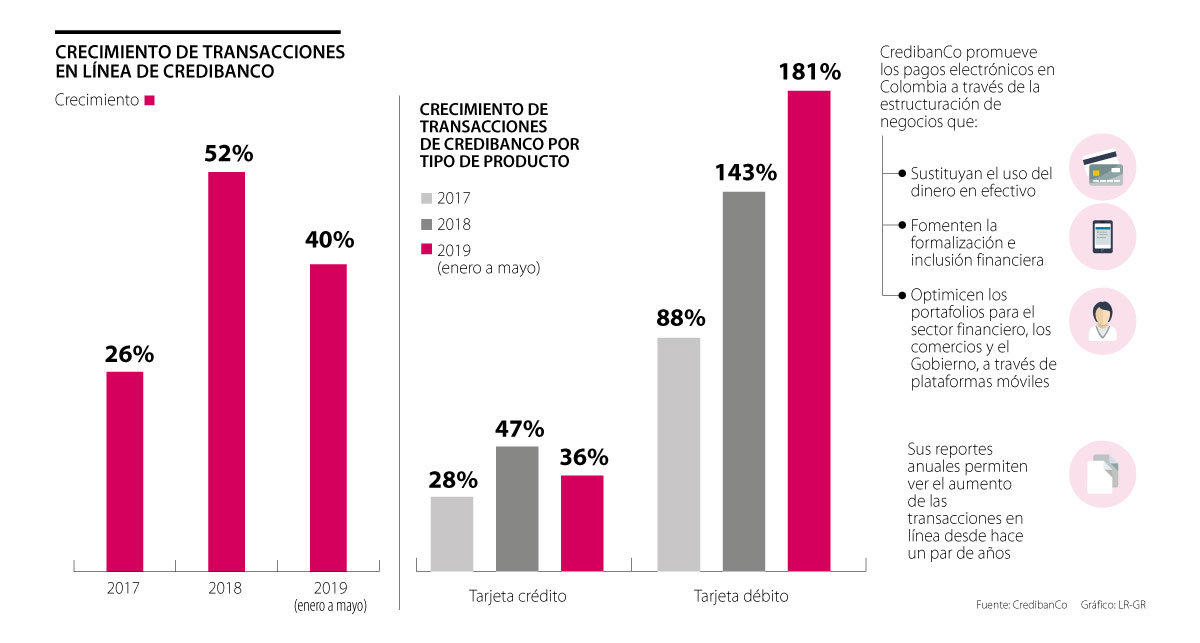 Según información de CredibanCo, el aumento de las transacciones en línea de enero a mayo de este año fue de 40%, el crecimiento en todo el 2017 fue de 26% y en 2018 fue de 52%.