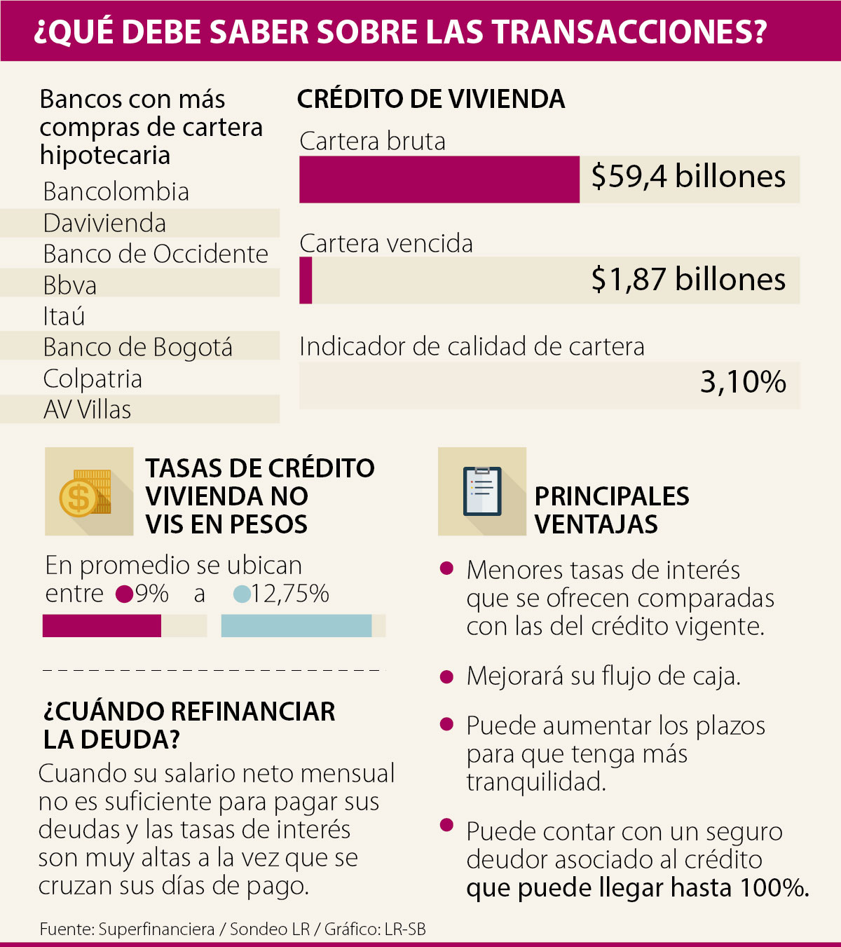 En el Banco de Bogotá, por ejemplo, las tasas inician desde 8,9% efectivo anual. “Las ventajas que tiene el cliente al realizar la compra de cartera es que al reducir la tasa de su crédito pagará un menor valor de la cuota mensual, lo que implica que mejora el flujo de caja. Este beneficio lo obtiene sin tener gastos de escrituración o hipoteca debido a que la garantía es cedida a favor del Banco de Bogotá y el pagaré es endosado. El cliente continúa con los beneficios tributarios que ofrecen los créditos de vivienda”, indicó Juan Manzanera, gerente Banca Vivienda de esta entidad.
