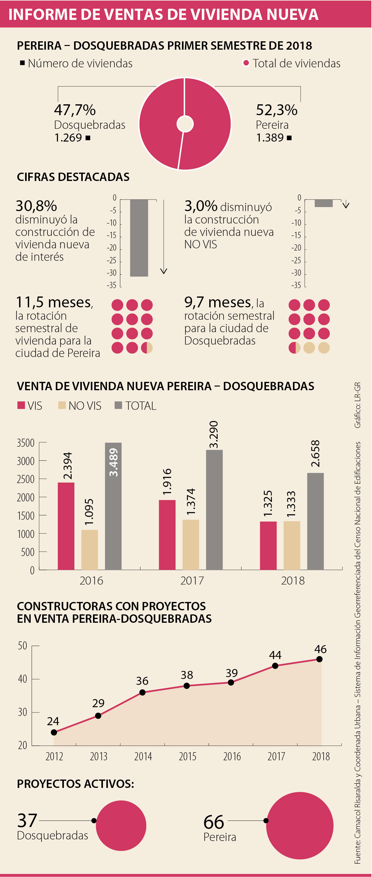 Los constructores tienen varios proyectos en Dosquebradas, donde el crecimiento del área licenciada superó 146,4% en el primer semestre de 2018 con 175.579 metros cuadrados. Esto es, 2.112 unidades de viviendas aprobadas, en especial los estratos tres y cuatro y en la VIS.