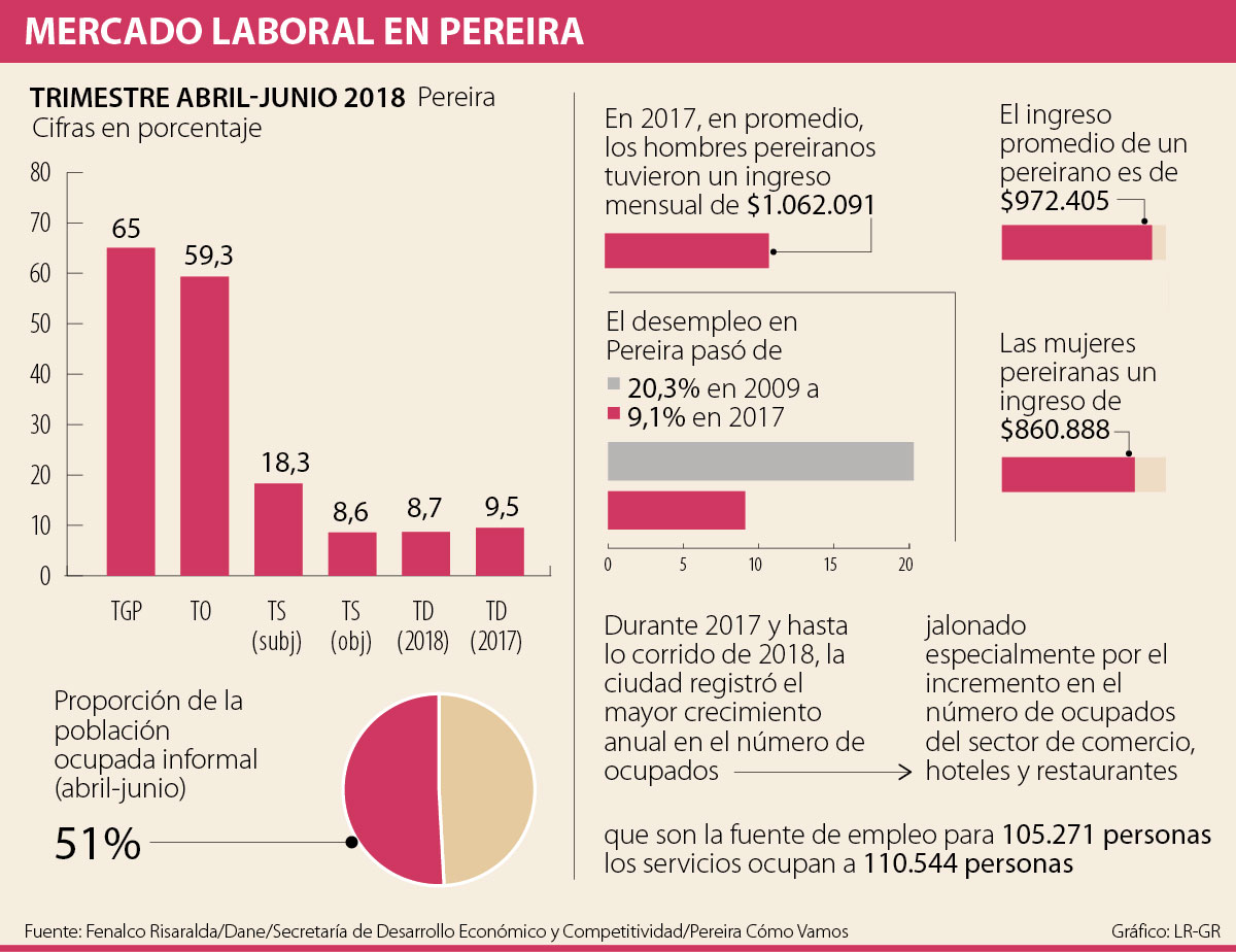 Durante 2017, y hasta lo corrido de 2018, Pereira registró el mayor crecimiento anual en el número de ocupados en la región y el tercero más alto dentro de las 23 ciudades y áreas metropolitanas, jalonado especialmente por incremento en el número de ocupados del sector de comercio, hoteles y restaurantes que es la fuente de empleo para 105.271 personas, mientras que los servicios ocupan a 110.544 personas.