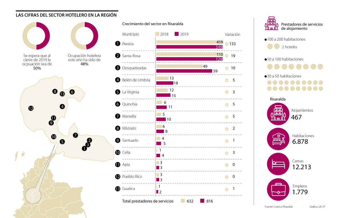 De acuerdo con Paula Andrea Arango, directora Ejecutiva de la Asociación hotelera y turística de Colombia (Cotelco) capítulo Risaralda, a pesar de que hotelería en la región no ha venido creciendo en grandes formatos, es decir hoteles de más de 100 habitaciones, si ha habido una muy buena dinámica, la cual permite ratificar que la mejor oferta hotelera del Eje Cafetero está en Pereira, lo que se da en gran medida por el auge comercial y los eventos que se realizan en la ciudad.