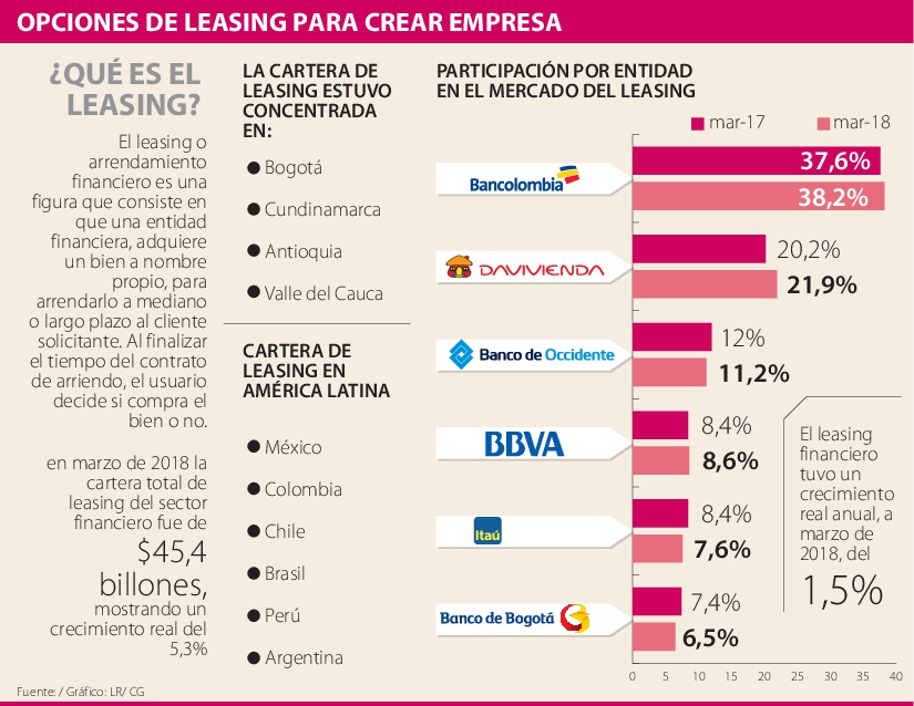 Según datos de Asobancaria, la cartera de leasing, durante marzo de este año, reportó $45,40 billones, lo que se tradujo en un crecimiento real de 5,3% respecto al mismo mes en 2017. Sin embargo, la entidad indicó que la penetración (12,5%) sigue baja en comparación con otros servicios financieros.