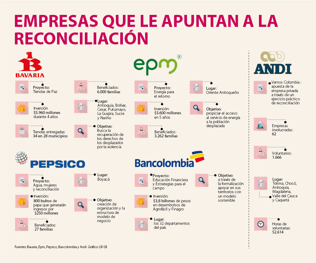 En la coyuntura actual que vive el país, las empresas son conscientes de la importancia que tienen sus aportes para lograr la reconciliación, es por esto que dentro de sus planes de responsabilidad social le apuntan a ayudar a las víctimas del conflicto armado, ya sea por donaciones, voluntariados, estrategias para desarrollar un negocio propio o a través de aportes para educación.