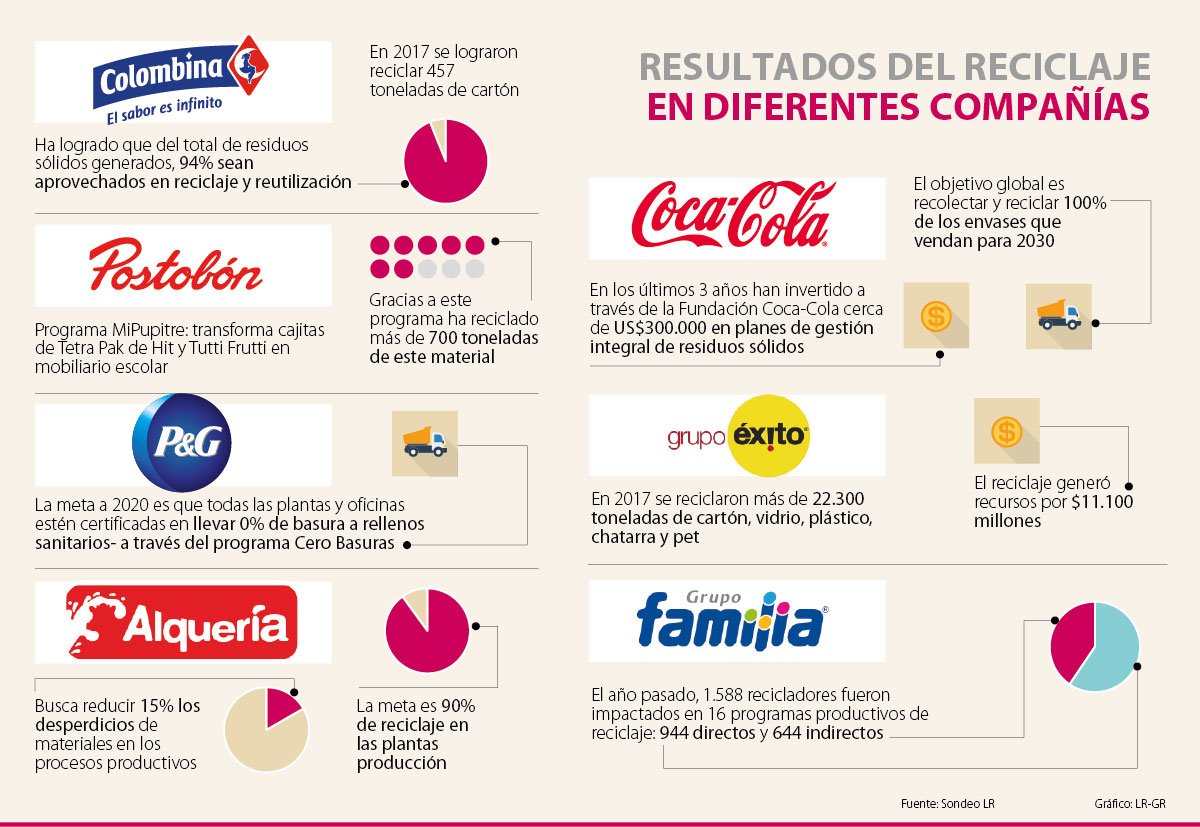 En el caso del sector comercio, compañías como el Grupo Éxito también trabajan por el reciclaje. En 2017 reciclaron más de 22.300 toneladas de cartón, vidrio, plástico, chatarra y pet, materiales que al comercializarse se transformaron en más de $11.100 millones. El producto de la comercialización representa 38% de los recursos que se entregan a la Fundación Éxito, la cual trabaja por erradicar la desnutrición infantil en Colombia.