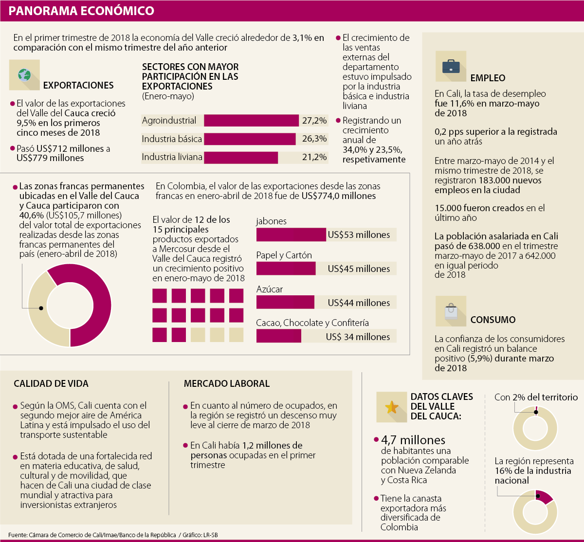 Diversos indicadores muestran que la actividad productiva de Cali y el Valle del Cauca tienen una destacada dinámica de crecimiento en lo corrido de 2018. Esto después de un año difícil para las empresas del país, en el que se mostró una desaceleración importante de la demanda local y el deterioro del contexto externo, tal como lo dijo Carlos Andrés Pérez, director de Estudios Económicos y Competitividad de la Cámara de Comercio de Cali.