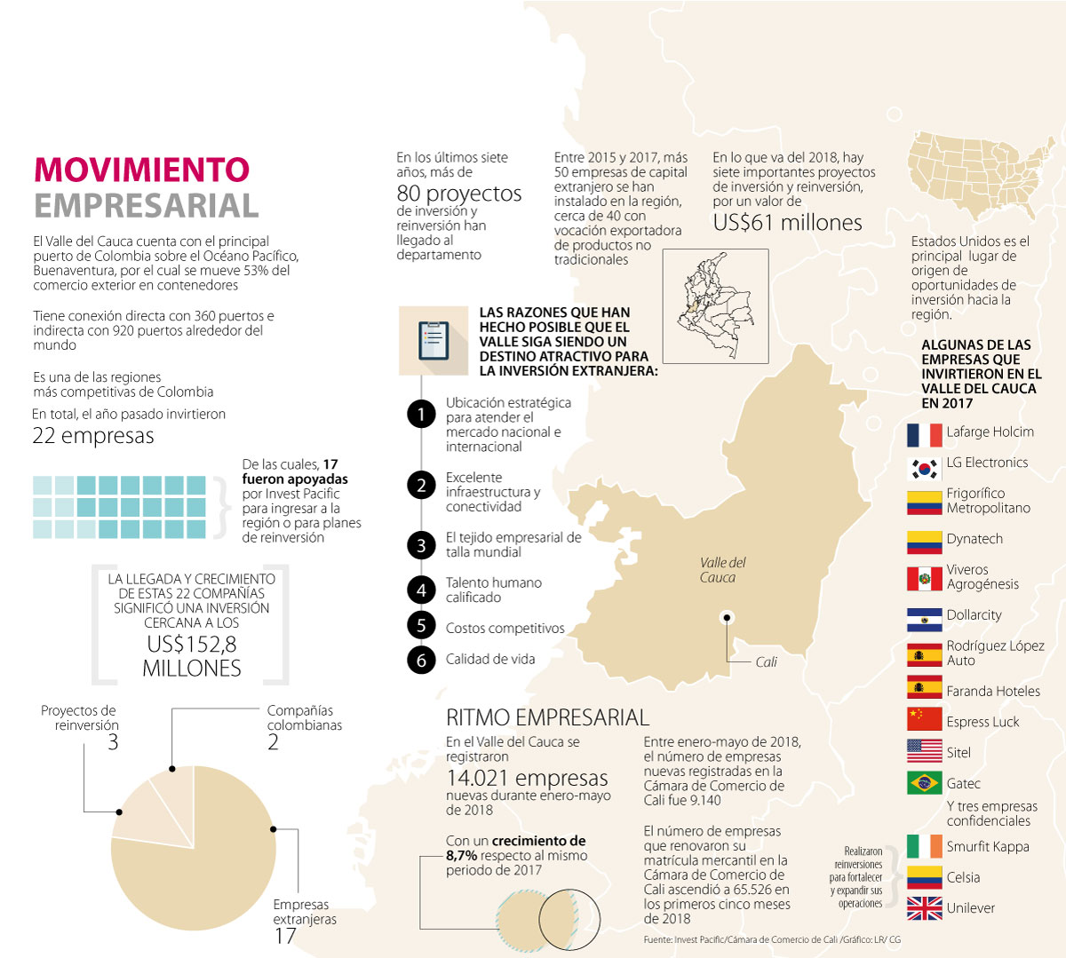De acuerdo con información de Invest Pacific, entidad encargada de la promoción para la inversión en Cali y todo el Valle del Cauca, entre 2015 y 2017, más de 50 empresas de capital extranjero se han instalado en la región, de ellas cerca de 40 tienen vocación exportadora de productos no tradicionales.