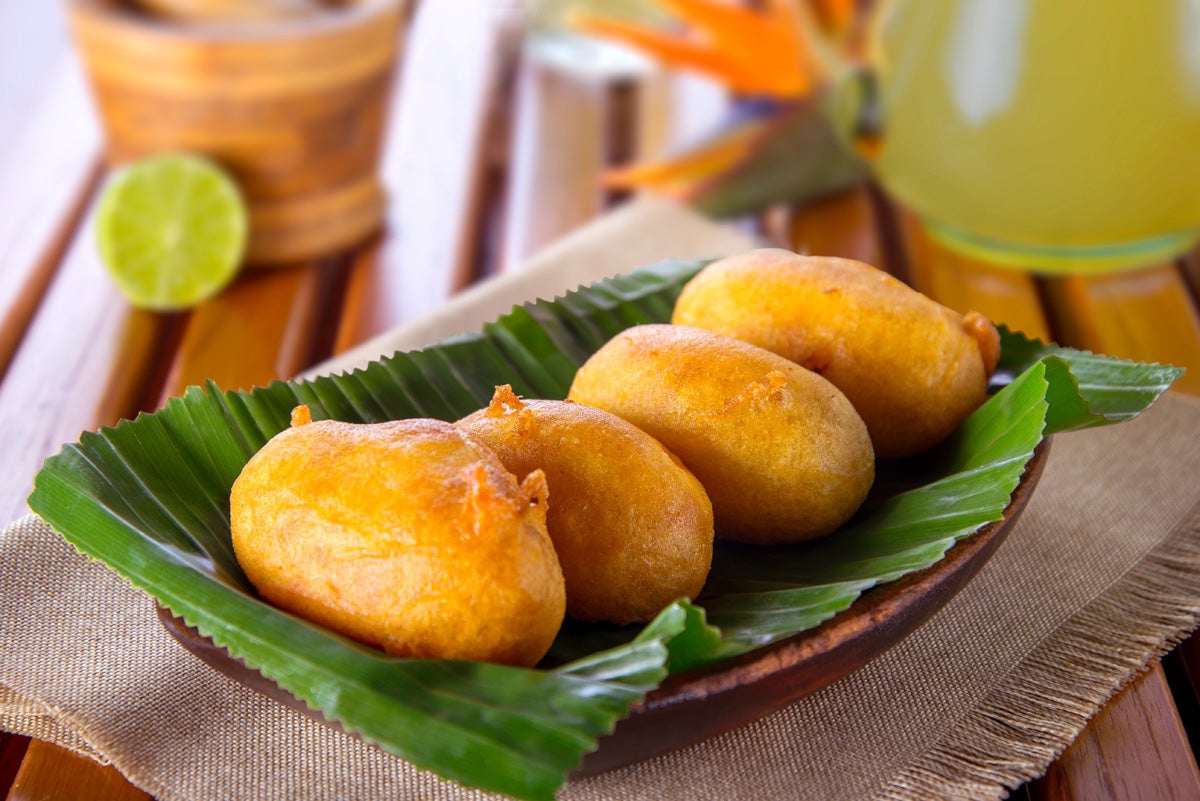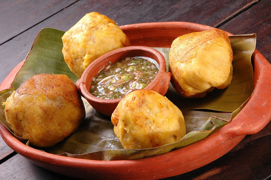 Son las típicas bolitas de plátano verde relleno con chicharrón de cerdo crocante y triturado.