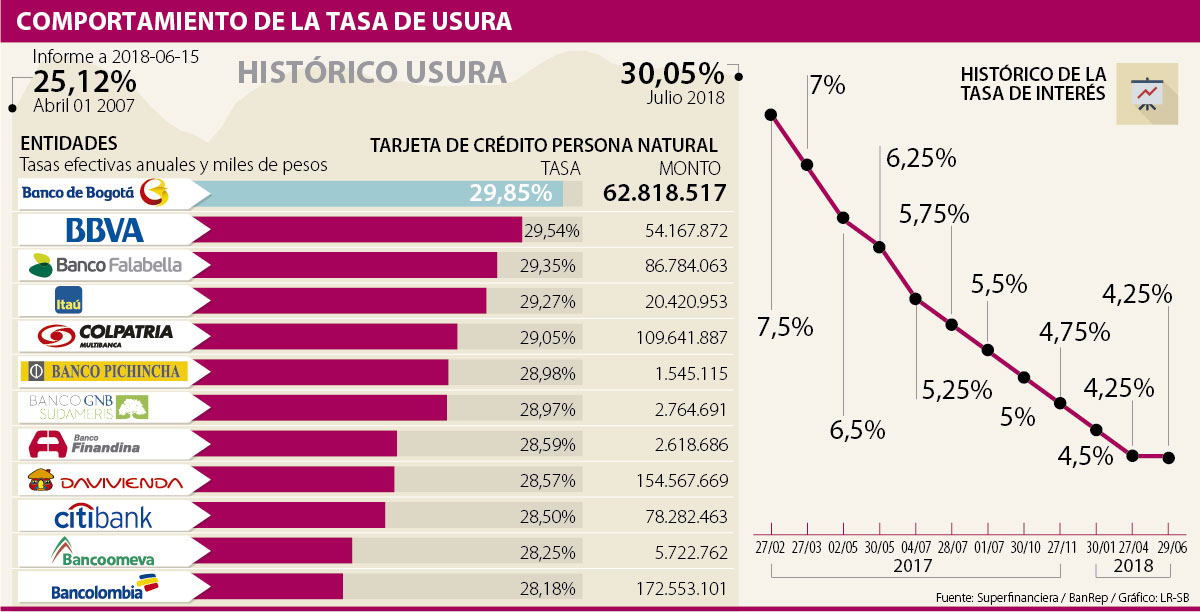 Aunque para junio el Emisor dio a conocer que mantendría su tasa de interés en 4,25%, el efecto de la baja de tasas en los establecimientos bancarios hasta ahora empiezan a verse, por lo que los analistas consultados por LR prevén que este techo, que para julio la Superintendencia Financiera lo certificó en 30,05%, seguirá a la baja durante el segundo semestre del año.