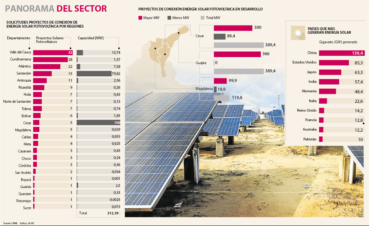 Al finalizar 2017, la Unidad de Planeación Minero Energética (UPME) había aprobado proyectos de energía solar fotovoltaica por 289 megavatios en Cesar, Guajira, Magdalena, Bolívar y Atlántico; y 97 megavatios en Meta, informó el ingeniero eléctrico Ricardo Humberto Ramírez, director General de la Unidad de Planeación Minero Energética (Upme). Y, se encontraban en estudio la conexión de capacidades de generación de energía solar en Cesar, Guajira y Magdalena, por 119,8 megavatios.