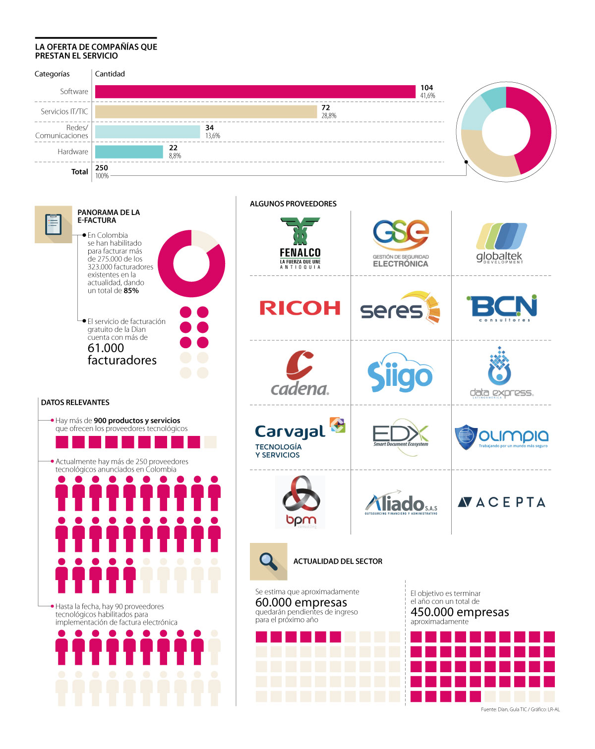 Dentro del catálogo de la Dian se encuentran organizaciones nacionales como la ya mencionada Cadena, Carvajal, Olimpia IT y Fenalco Antioquia, así como compañías internacionales como la japonesa Ricoh, la mexicana Data Express Latinoamérica o Seres, filial del Grupo Docaposte (ver gráfico).