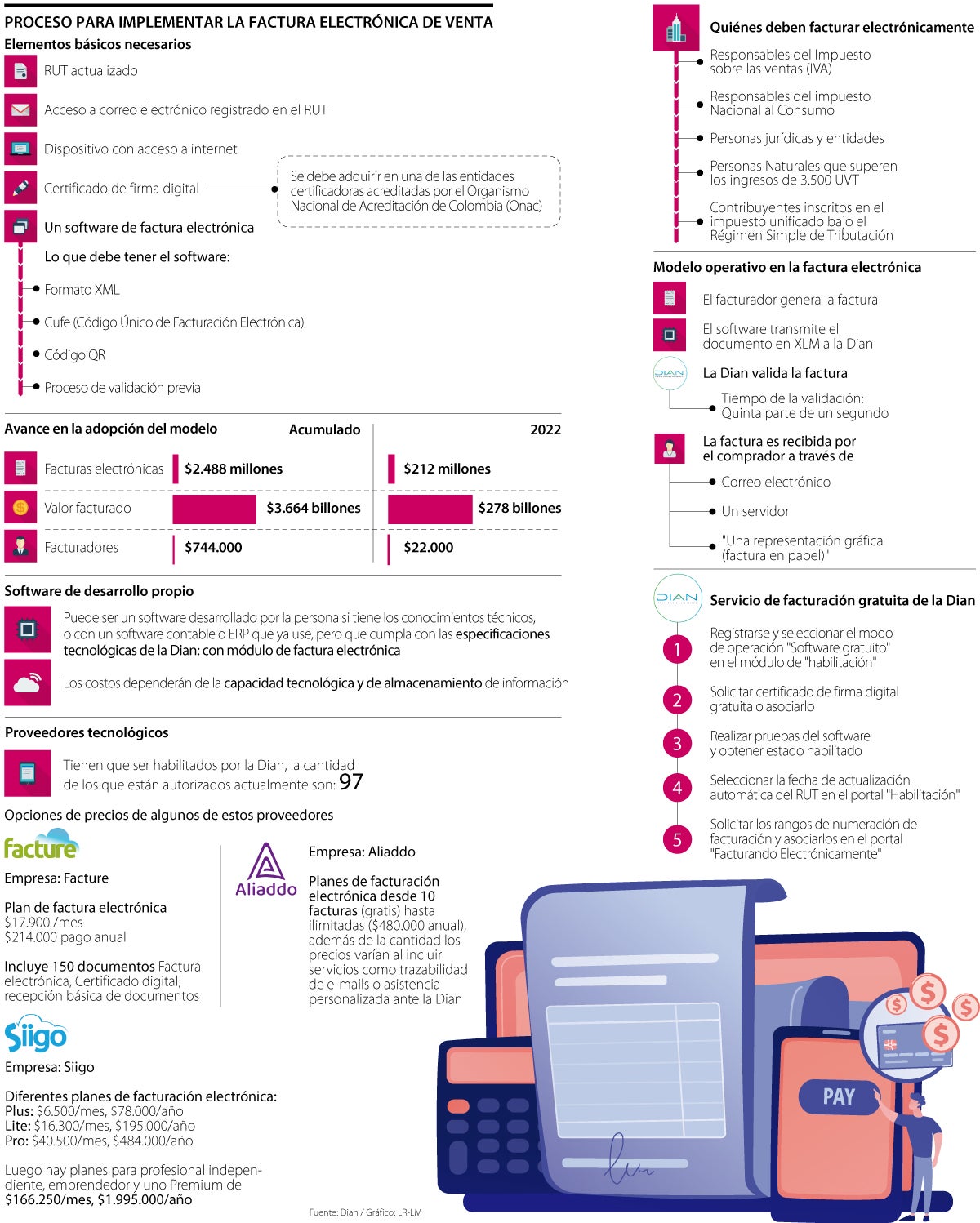 La tercera opción es contratando un proveedor tecnológico especializado. Hay una lista de las empresas que ha autorizado la Dian para ofrecer este servicio en Colombia, que también se puede consultar en la página, algunas de ellas son compañías como Siigo, Alegra o Facture.