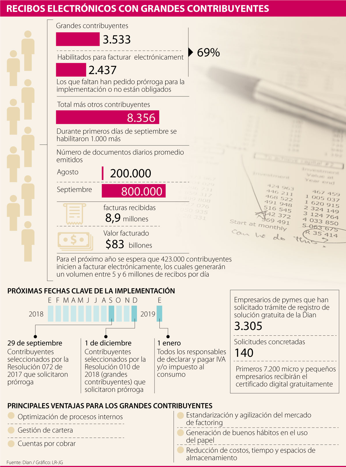 En este sentido, de 3.533, cerca de 2.437 ya están habilitados para facturar electrónicamente. “Los no habilitados corresponden a grandes contribuyentes que pidieron prórroga o no están obligados a hacerlo”, destacó la directiva de la Dian.