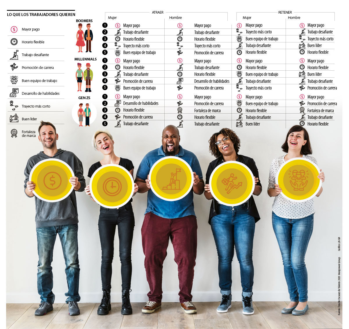 Según el estudio ‘Cerrando las brechas de habilidades: lo que los trabajadores quieren’, de la agencia de servicios y soluciones de capital humano Manpower Group, el salario es el factor principal de atracción y retención para todos los trabajadores menores de 65 años. Sin embargo, se lee en el documento, “los sueldos están creciendo la mitad de rápido que hace 10 años, especialmente para los trabajadores de menores ingresos”. Por eso, “las empresas tienen que ser creativas para mejorar las formas de compensación más allá del dinero en efectivo, de modo que generen y atraigan talento”.