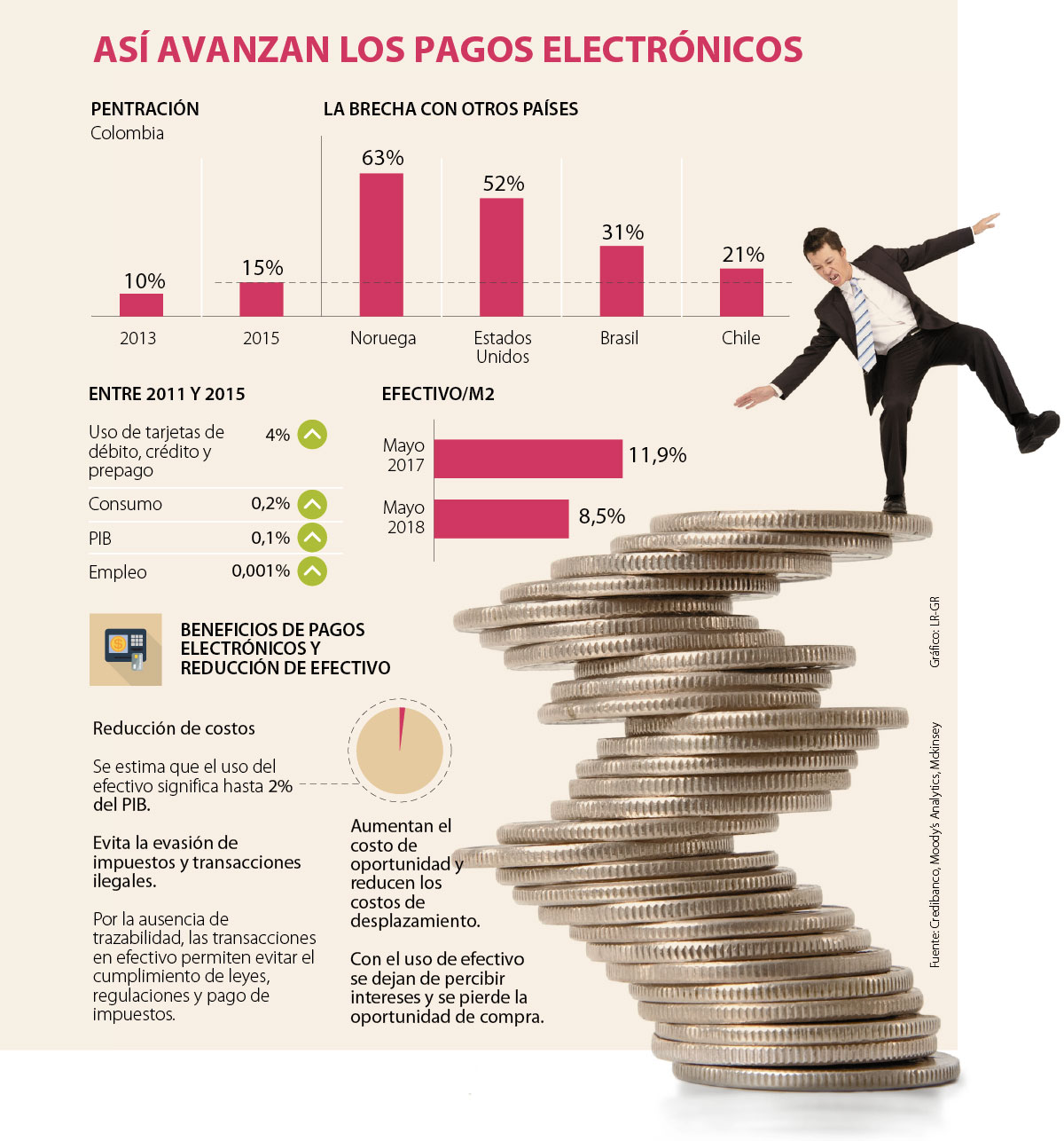Así lo confirmó María Elvira Restrepo, vicepresidente de productos en CredibanCo, quien recordó que, si bien los Medios de Pago Electrónico (MPE) pasaron de 10% en 2013 a 15% en 2015, el porcentaje sigue siendo muy inferior comparado con otros países del mundo como Noruega (63%), Estados Unidos (52%) e incluso países de la región como Brasil o Chile, que registran con 31% y 21%, respectivamente.