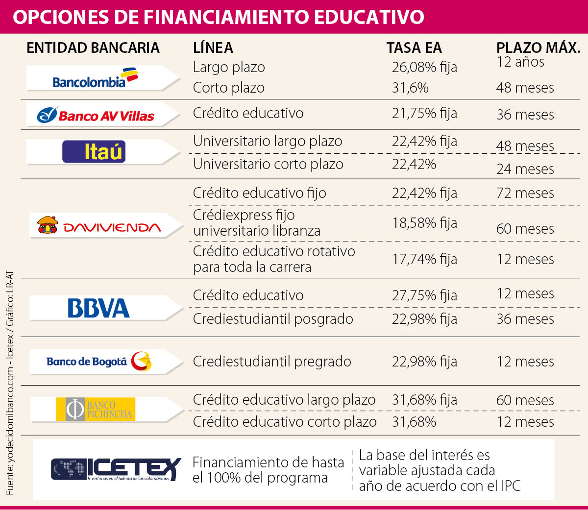 A la lista, se suma Davivienda con tres líneas: educativo fijo, crediexpress fijo y educativo rotativo. En el primer caso, el deudor contará hasta con 72 meses para pagar y el banco le concede un periodo de gracia de seis meses. En los tres productos se cubre 100% del programa académico.