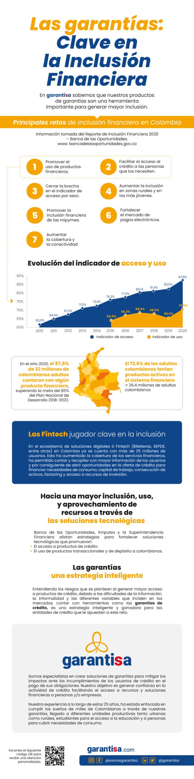 En el año 2020, el 87,8% de 32 millones de colombianos contaron con algún producto financiero y el 72,6% tuvo productos activos en el sistema financiero.