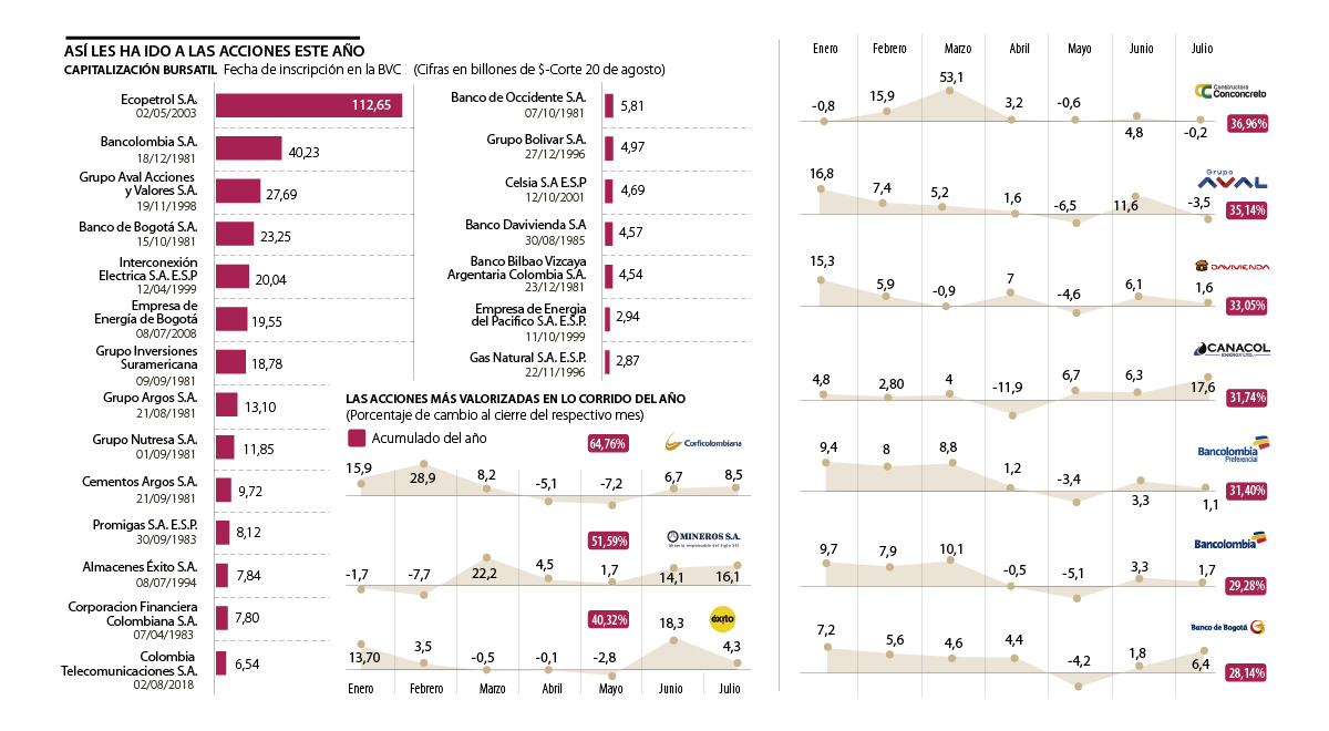 Entre enero y julio las acciones que mejor desempeño han tenido en la BVC están lideradas por Corficolombiana ya que se valorizó 64,76%, le siguen Mineros con alza de 51,59%, Grupo Éxito que subió 40,32%, Conconcreto 36,96%, y las acciones de Grupo Aval 35,14%.