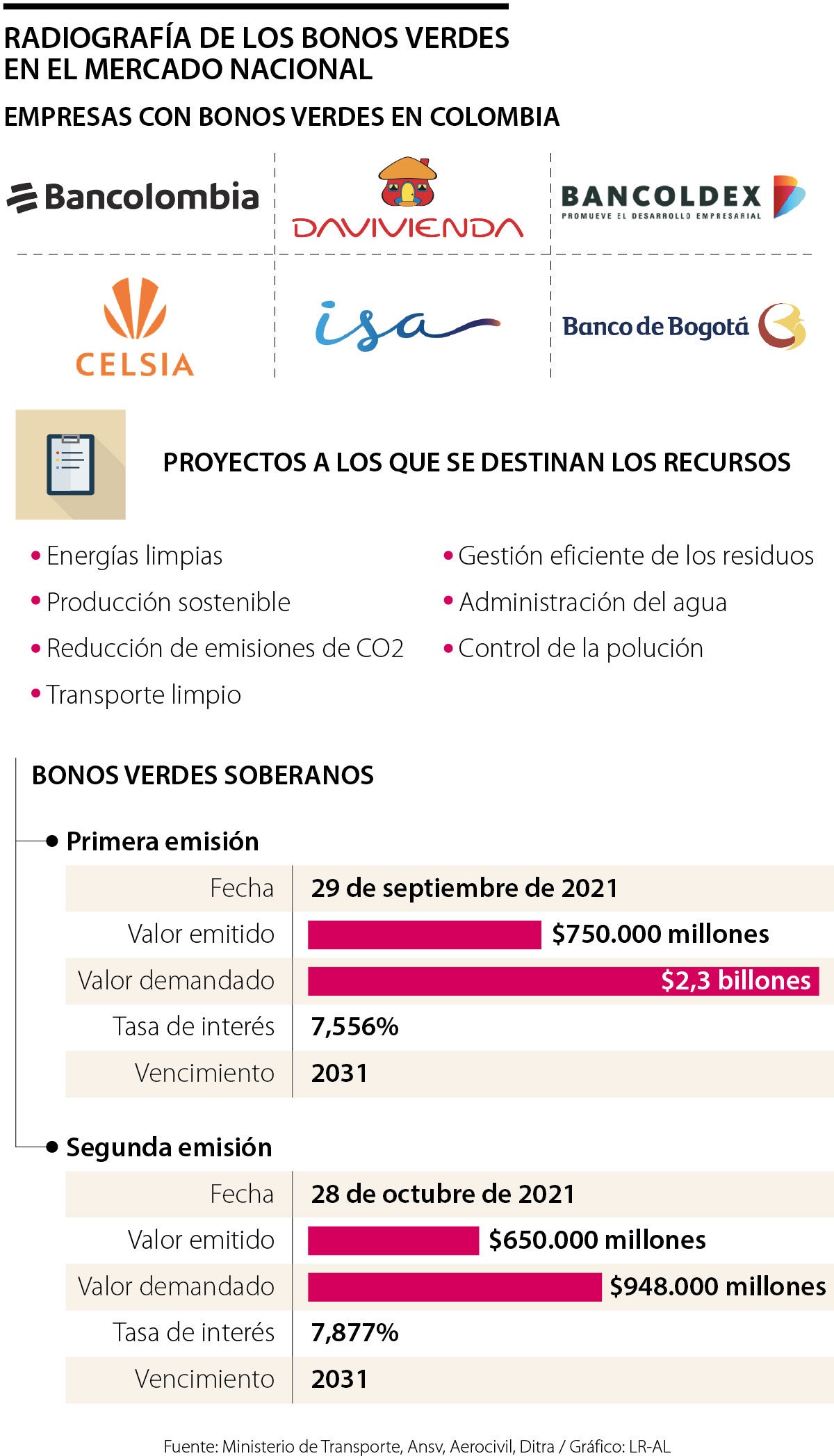 Las emisiones de bonos verdes en el país comenzaron en 2017 y cada vez van aumentando en frecuencia y volumen. Empresas como Bancóldex, Bancolombia, Davivienda, Celsia, ISA y el Banco de Bogotá han realizado colocaciones exitosas de este tipo de papeles para financiar proyectos que tienen que ver con producción sostenible, generación de energías limpias, reducción de las emisiones de gases de carbono, transporte limpio, construcción sostenible gestión eficiente de los residuos, gestión y protección del recurso hídrico y control de la polución, entre otras.