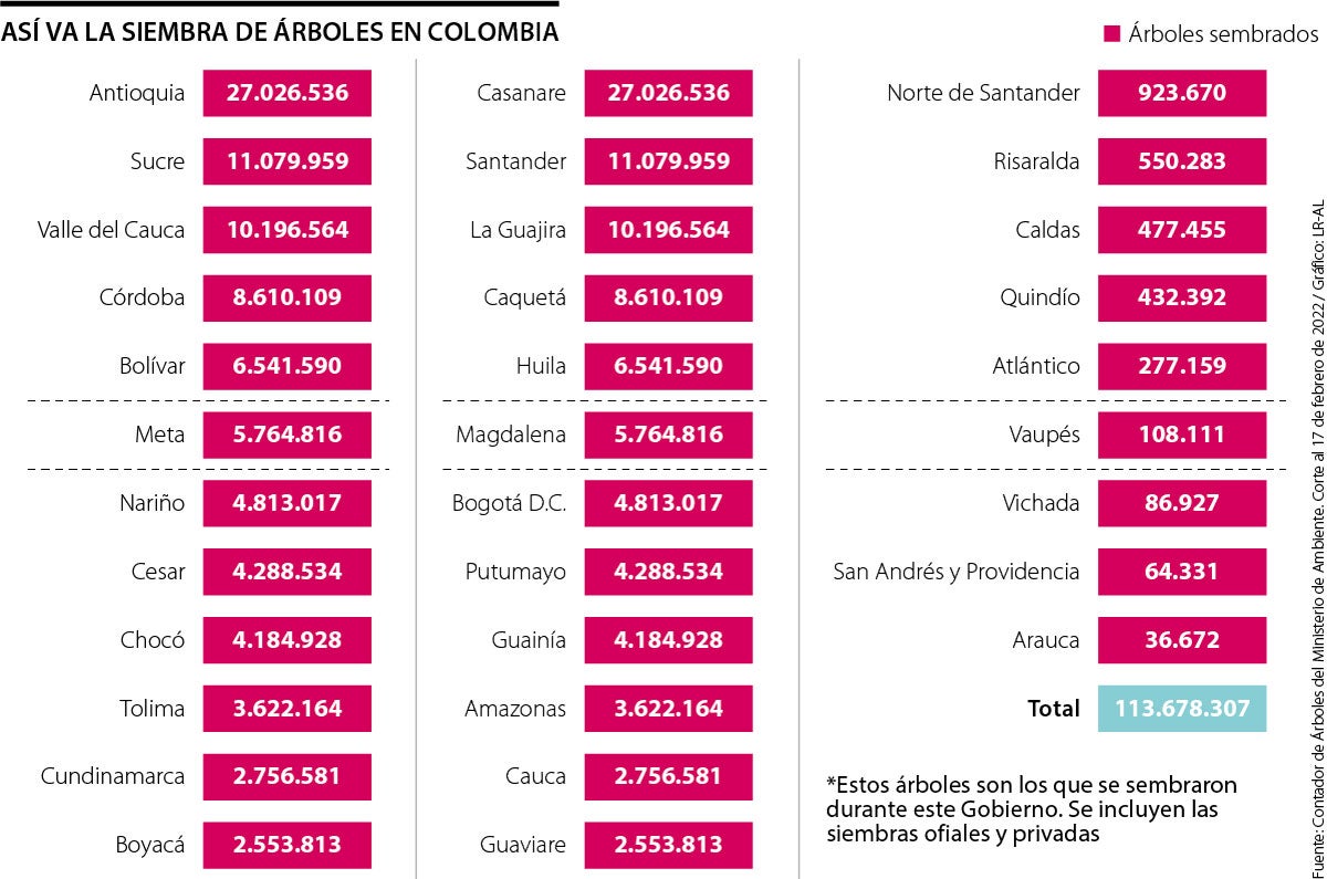 En el país hay compañías y gremios que se destacan en la siembra de árboles como Andi, la Federación Nacional de Cafeteros, Continental Gold, Cerrejón, Grupo Nutresa, FNC-Nespresso, Fedegan, PorkColombia, Grupo Argos y Holcim, entre otras.