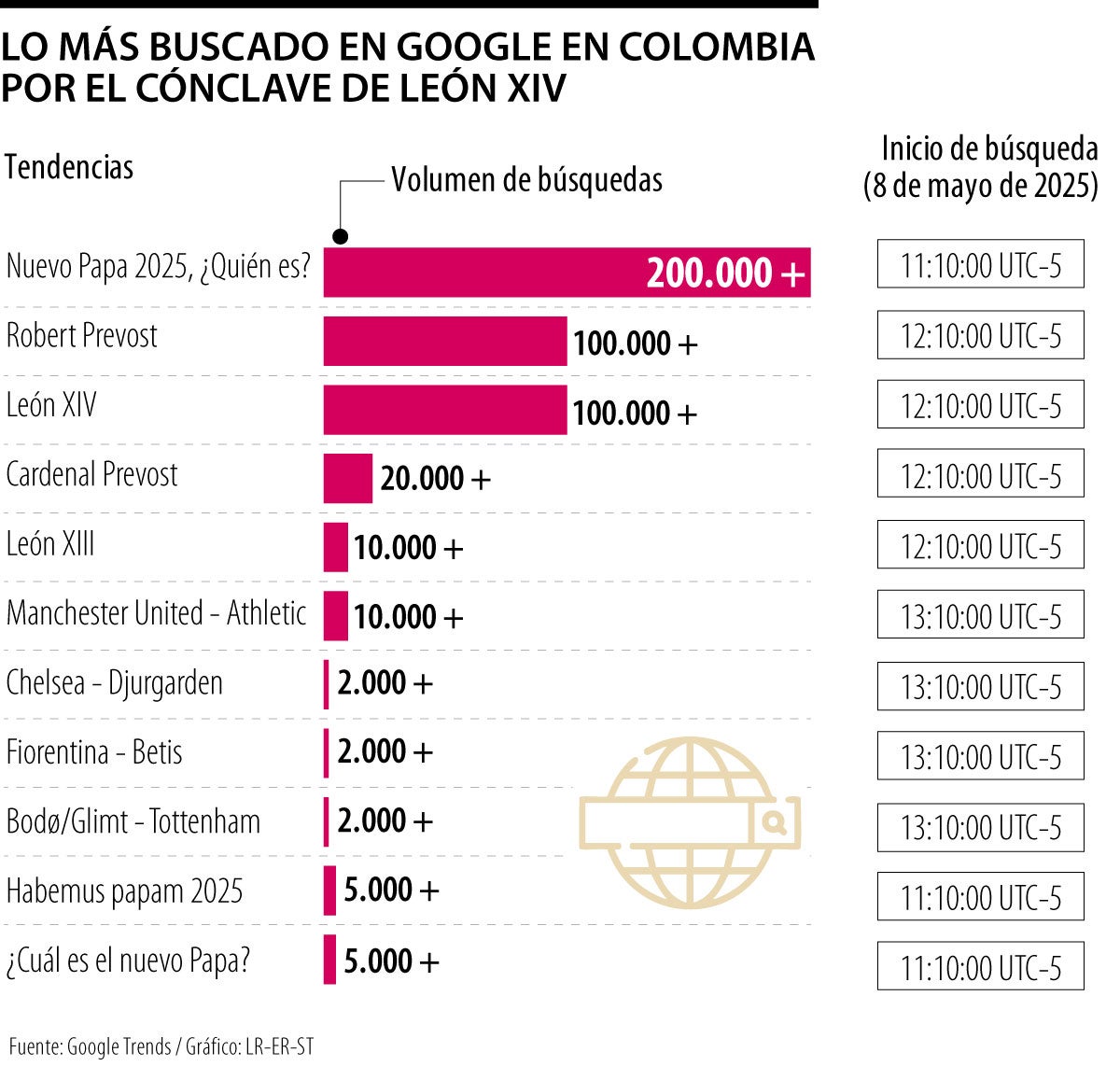 Según el recuento de Google Trends, el jueves, a las 11:10 a.m. (hora colombiana), la tendencia ‘Nuevo Papa 2025 quién es’ superó las 200.000 búsquedas, convirtiéndose en el tema más buscado en el país. Apenas una hora después (12:10 p.m.), el nombre del elegido, Robert Prevost, alcanzaba más de 100.000 búsquedas.