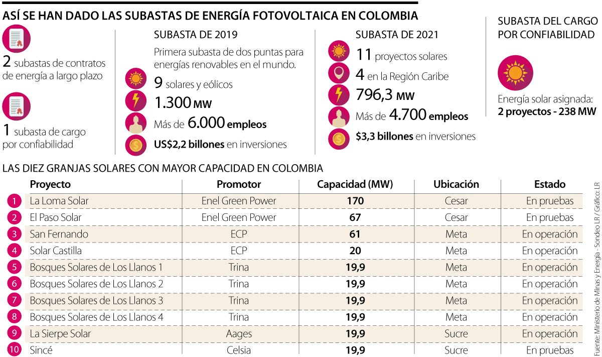 El Ministerio de Minas y Energías, en respuesta a LR, señaló que, a la fecha, se tienen en pruebas y en operación 850 megavatios (MW) de energías renovables -entre ellas la solar-, que contribuyen a la reducción de 1.3 millones de toneladas de CO2 al año.