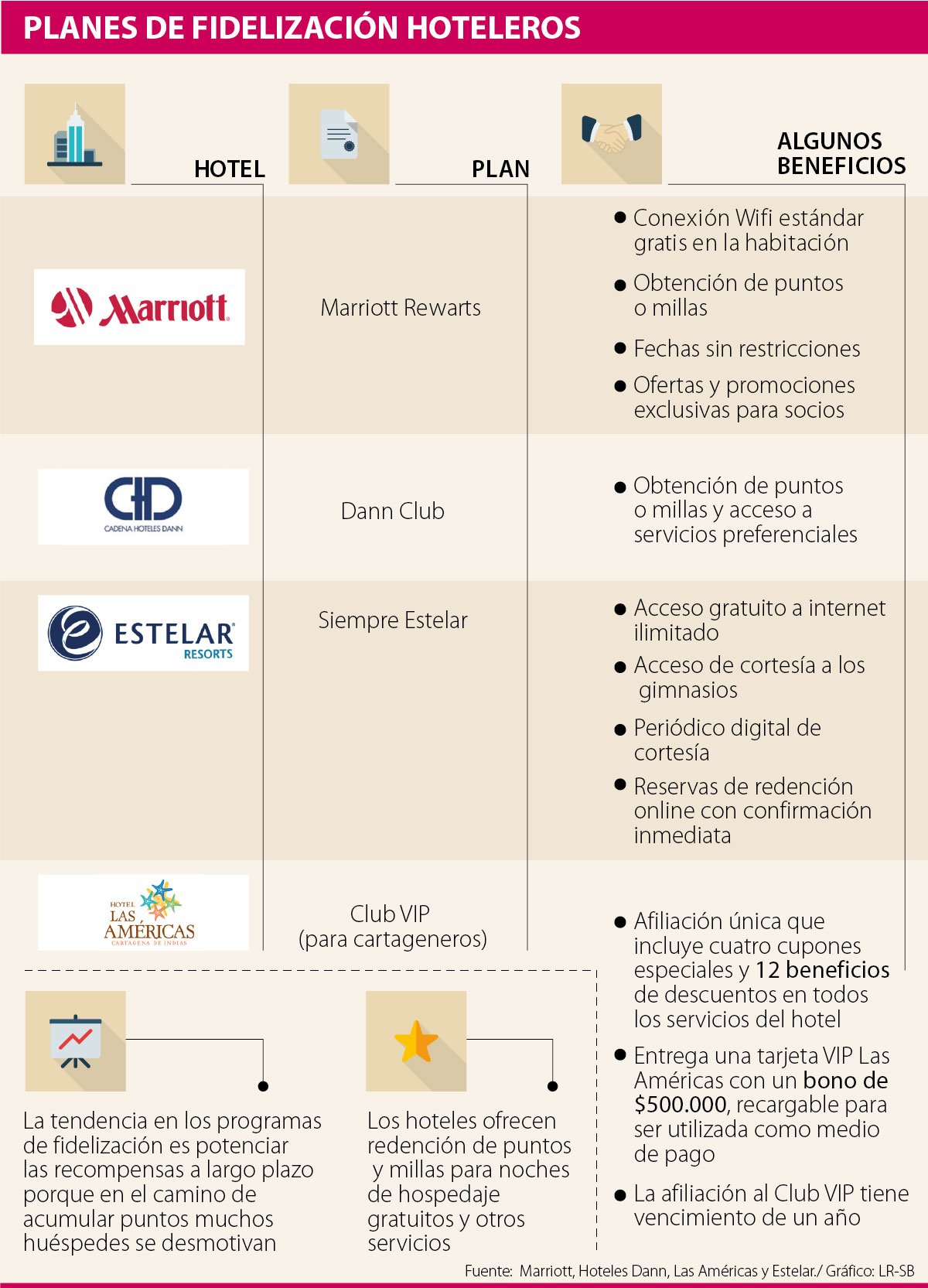 Las cadenas de hoteles Marriot, Dann y Estelar cuentan con planes de fidelización para sus huéspedes que les permiten acceder a una serie de beneficios en las tarifas, hospedaje gratis por un número de noches determinado y otros servicios que ofrecen los establecimientos. El hotel Las Américas lanzó el Club VIP, programa cuyos beneficiarios son los cartageneros y residentes de la ciudad turística.