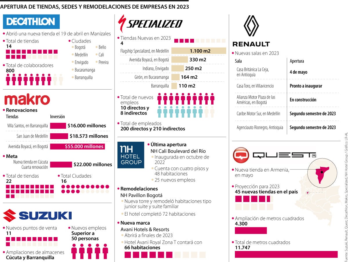En el sector automotor, pese al impacto de decrecimiento que ha tenido cercano de 20%, también sostiene una buena parte de los empleos en Colombia. Renault abrirá cuatro nuevas salas en 2023. La más reciente apertura será el próximo 4 de mayo en La Ceja, Antioquia. Pronto inaugurarán la sala Casa Toro Villavicencio, está en construcción otra sala en Bogotá y planean abrir dos más en el segundo semestre, en Medellín y Antioquia.