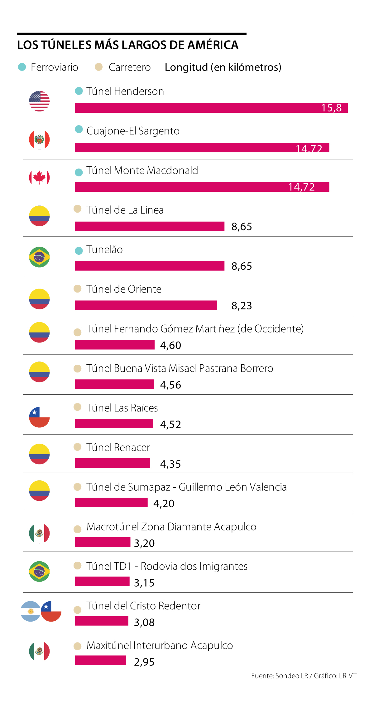 Si se tienen en cuenta los túneles ferroviarios, el más grande en el continente americano es el Túnel Henderson, que tiene una longitud de 15,8 kilómetros y está ubicado en Colorado (Estados Unidos). El segundo lugar con 14,72 kilómetros de largo están el túnel ferroviario Cuajone - El Sargento, localizado entre las minas de Cuajone y de Toquepala (Perú), y el Túnel Monte Macdonald, construido a través de dicho monte en Canadá. Les siguen Tunelão, el cual tiene una longitud ligeramente inferior a la del Túnel de La Línea y está en el estado de Minas Gerais (Brasil).