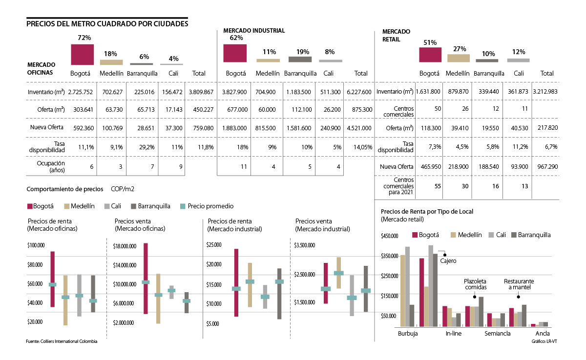 En ese mismo orden de ideas, el estudio reveló que además de la oferta elevada que presenta Bogotá, los precios de renta y venta en el mercado de oficinas son los más altos. Calculan que la renta en la capital del país tiende a estar entre $58.000 y $60.000 por metro cuadrado, mientras que la venta puede llegar a valer hasta $10 millones por metro cuadrado.