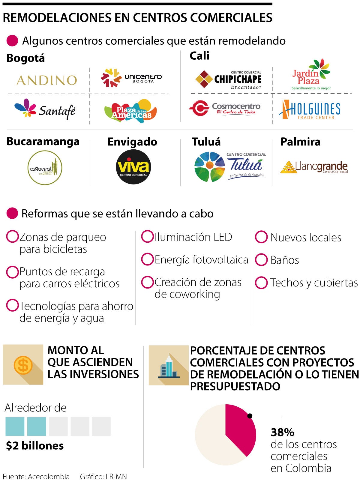 Algunos de los centros comerciales que están remodelando o han anunciado remodelaciones son Plaza de la Américas, Unicentro y Santafé en Bogotá; Chipichape, Jardín Plaza, Cosmocentro y Holguines Trade Center en Cali; Viva Envigado en Envigado, Llanogrande en Palmira y Centro Comercial Tuluá en Tuluá.