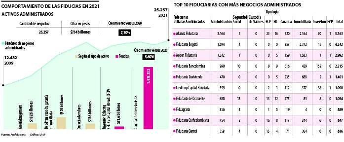 Al cierre de 2021, los activos administrados por las sociedades fiduciarias en Colombia se ubicaron en un total de $734 billones