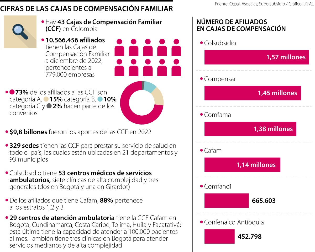 Las cajas de compensación familiar juegan un papel determinante en el bienestar y salud de los más de 10,5 millones de afiliados a las 43 cajas que existen en Colombia, de los cuales 73% son categoría A, 15% categoría B, 10% categoría C y 2% hacen parte de los convenios.