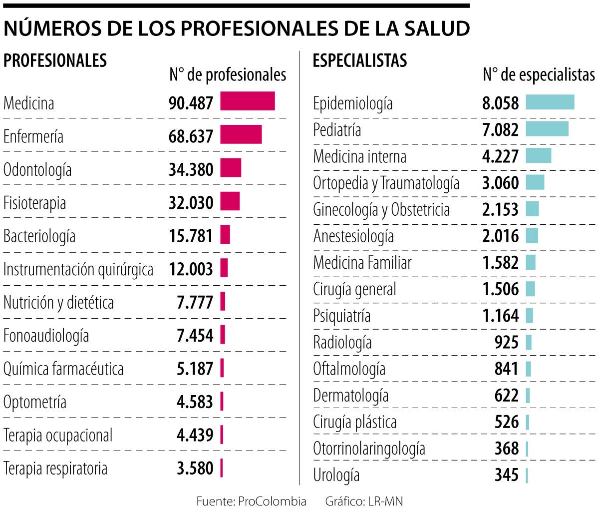 En Colombia ejercen médicos de otras áreas como fisioterapia (32.030), bacteriología (15.781), instrumentación quirúrgica (12.003) y nutrición y dietética (7.777).