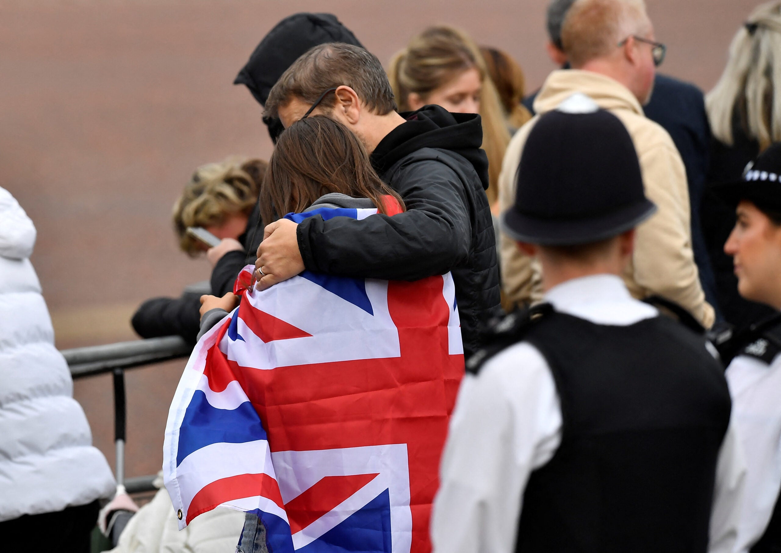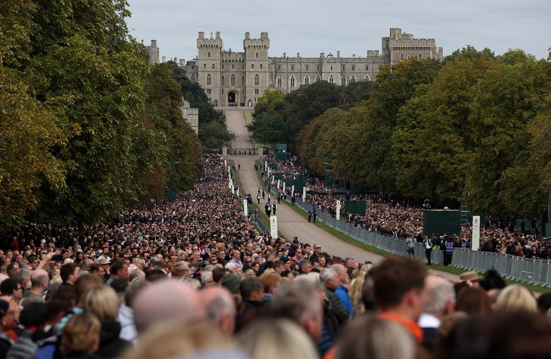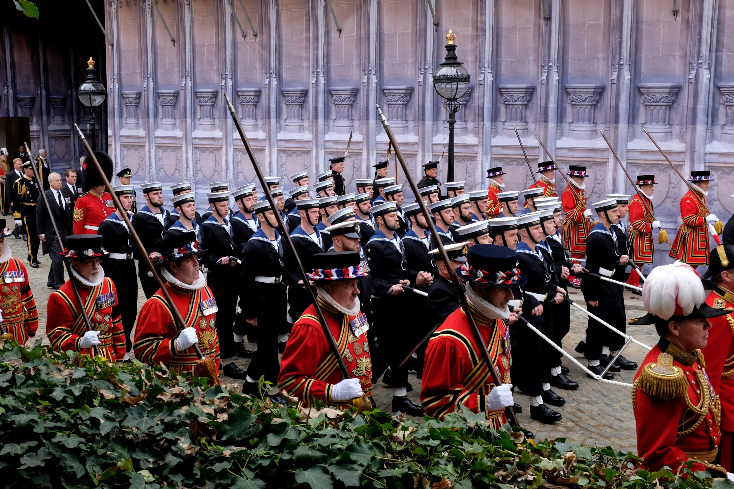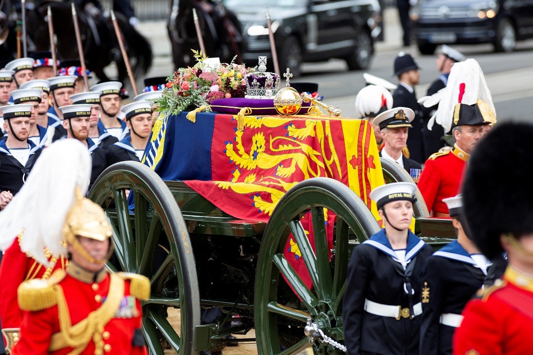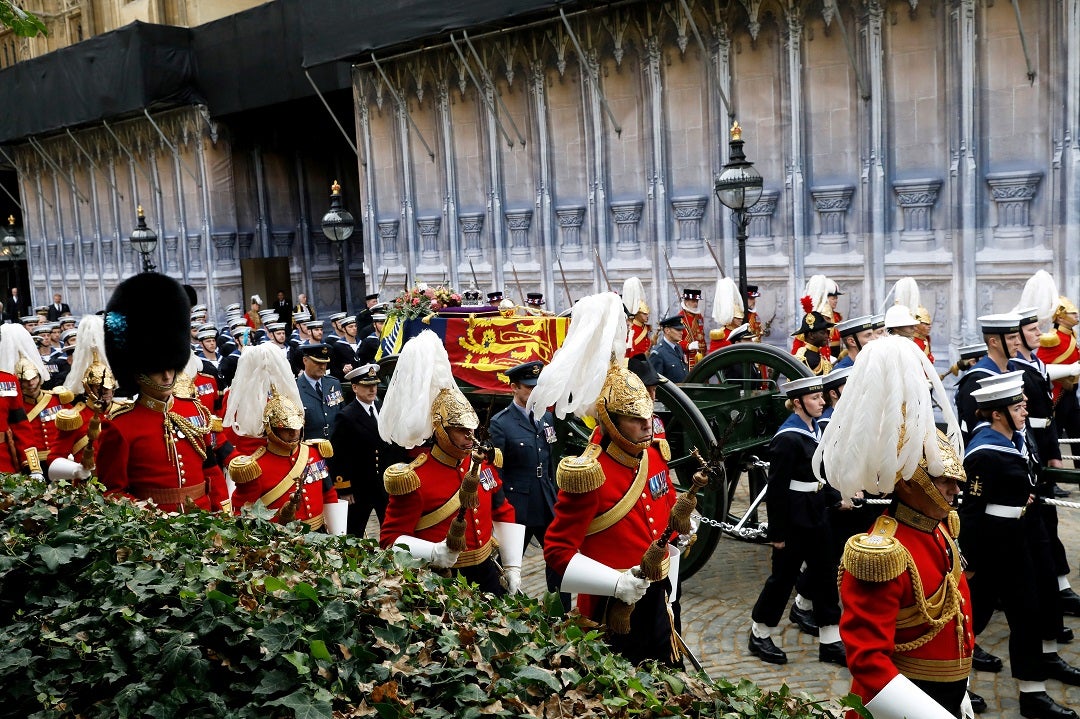 Decenas de miles de personas se alinearon en las calles mientras el féretro de la reina hacía el corto trayecto desde Westminster Hall, en un carro de artillería tirado por 142 marineros con los brazos enlazados. Una campana tañó y las gaitas sonaron.