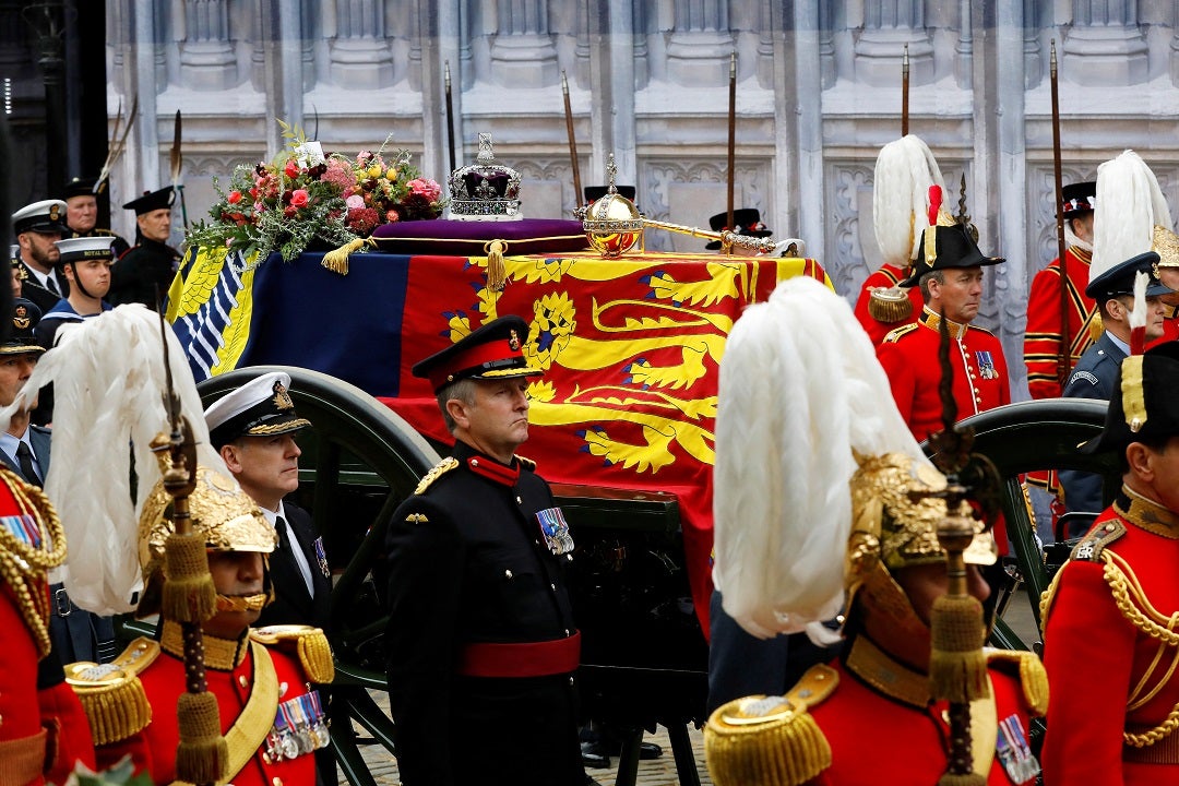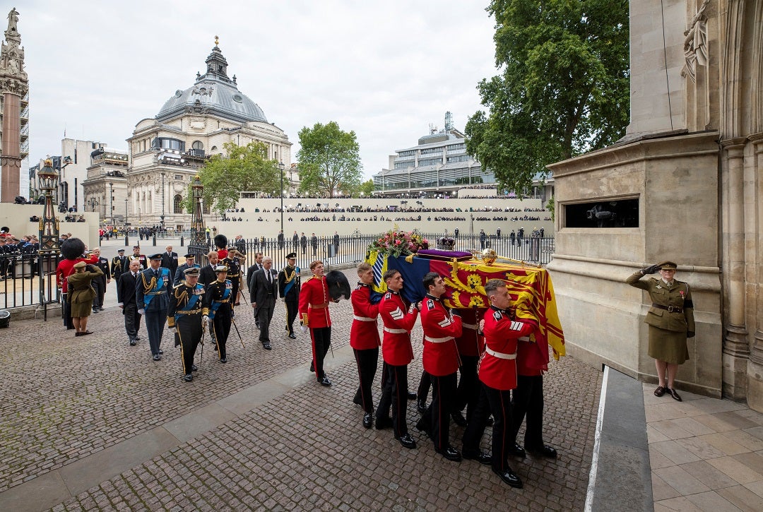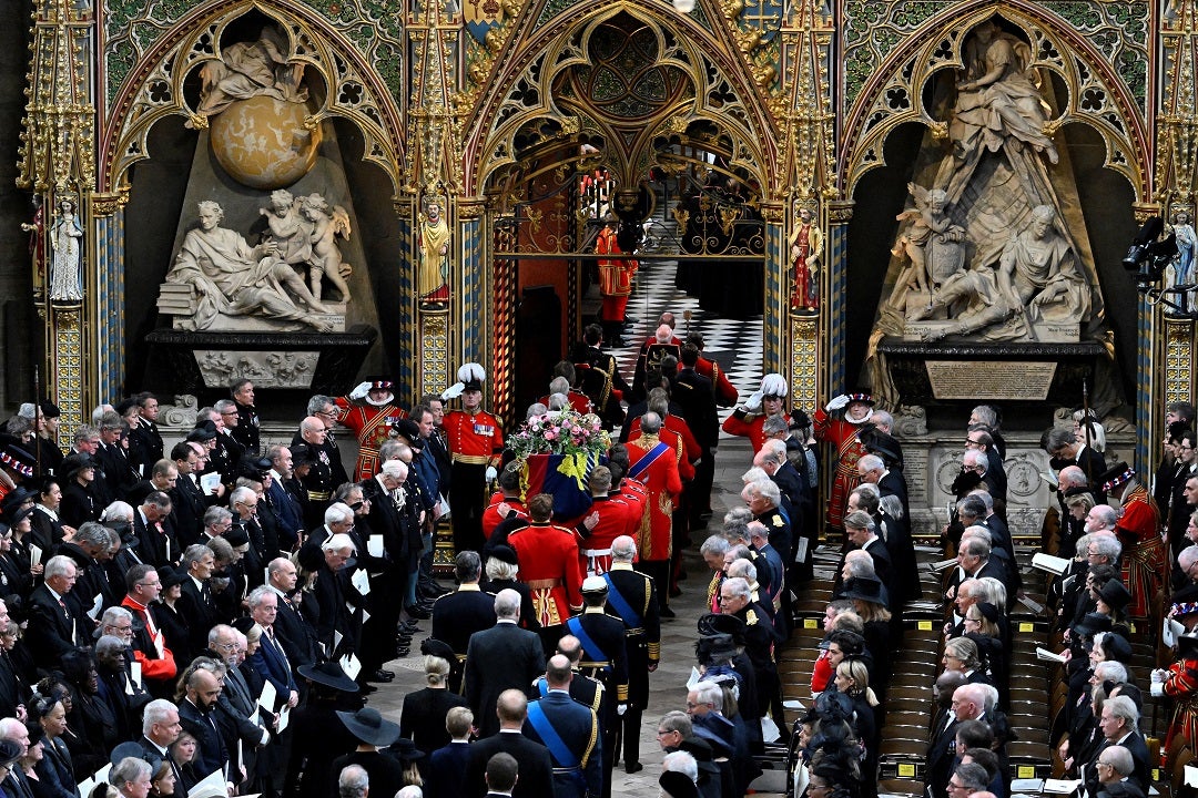 En escenas de inimitable pompa, los portadores del féretro llevaron el ataúd envuelto en una bandera a lo largo del pasillo en el primer funeral de Estado del país desde 1965, cuando Winston Churchill recibió ese honor.