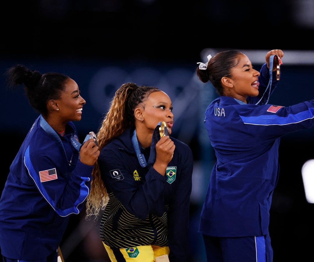 La medallista de oro Rebeca Andrade de Brasil, la medallista de plata Simone Biles de Estados Unidos y la medallista de bronce Jordan Chiles de Estados Unidos posan con sus medallas en el podio.
