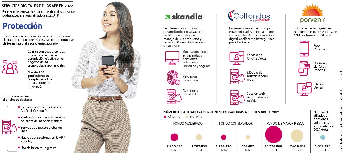 En el caso de Colfondos, la compañía anunció que las inversiones en tecnología están enfocadas principalmente en proyectos de transformación digital, analítica y ciberseguridad. Es por esto, que en septiembre de 2021, se implementó la Oficina Virtual, un canal que brinda asesoría en temas pensionales a los usuarios de una forma fácil y personalizada. También en este año, tendrán a disposición el módulo de historia laboral web, en el que sus clientes podrán conocer el detalle de toda su cotización y los vacíos laborales que presentan. Adicionalmente, contarán con la sección Acompañamos Tu Vida, en la que los afiliados podrán encontrar información relevante sobre la construcción de su ahorro pensional y los principales hitos que deberán cumplir durante su etapa productiva.