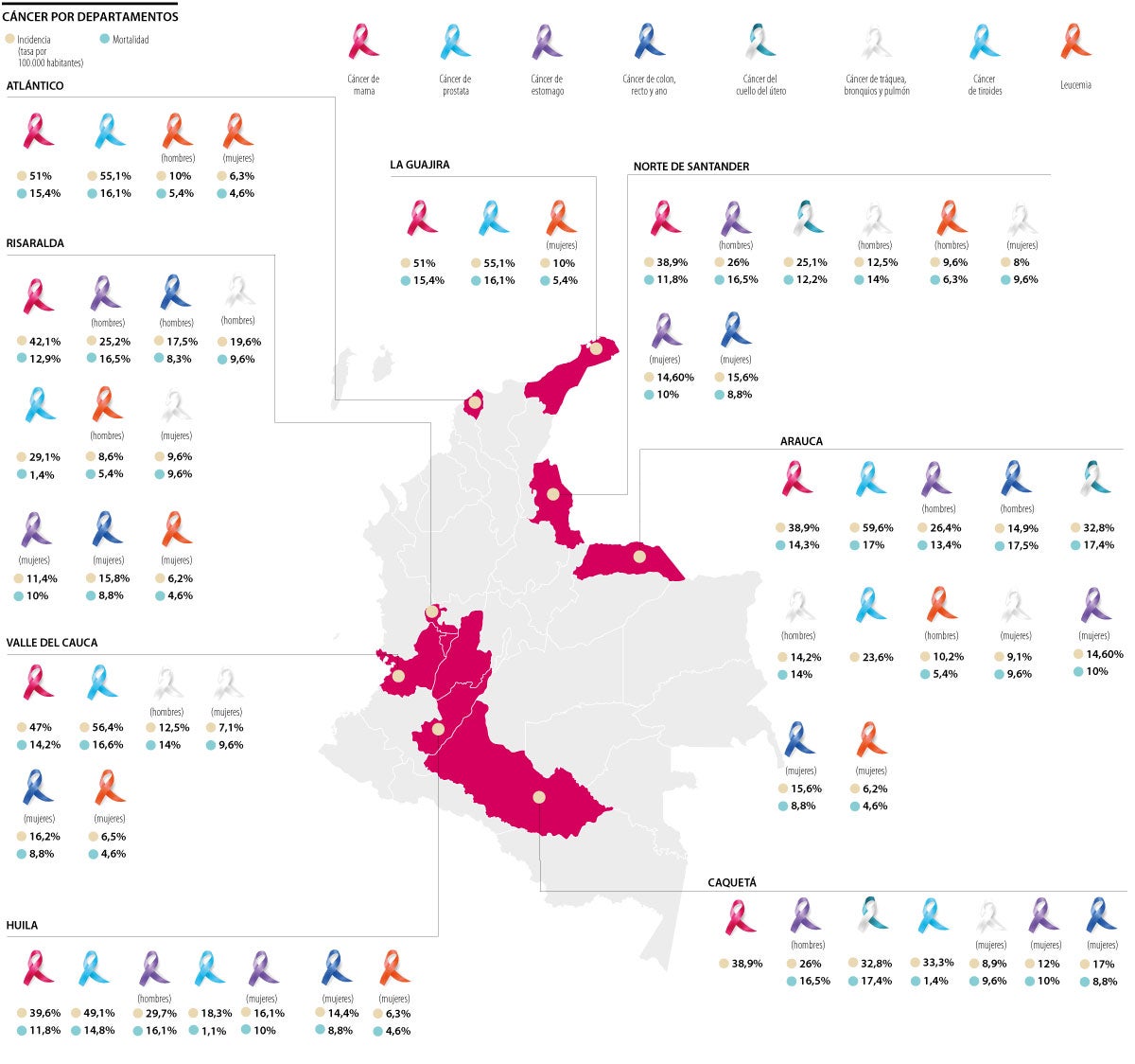 La mayor incidencia de esta tipología de cáncer está situada en Risaralda, con 19,6% para hombres y 13,7% para mujeres.