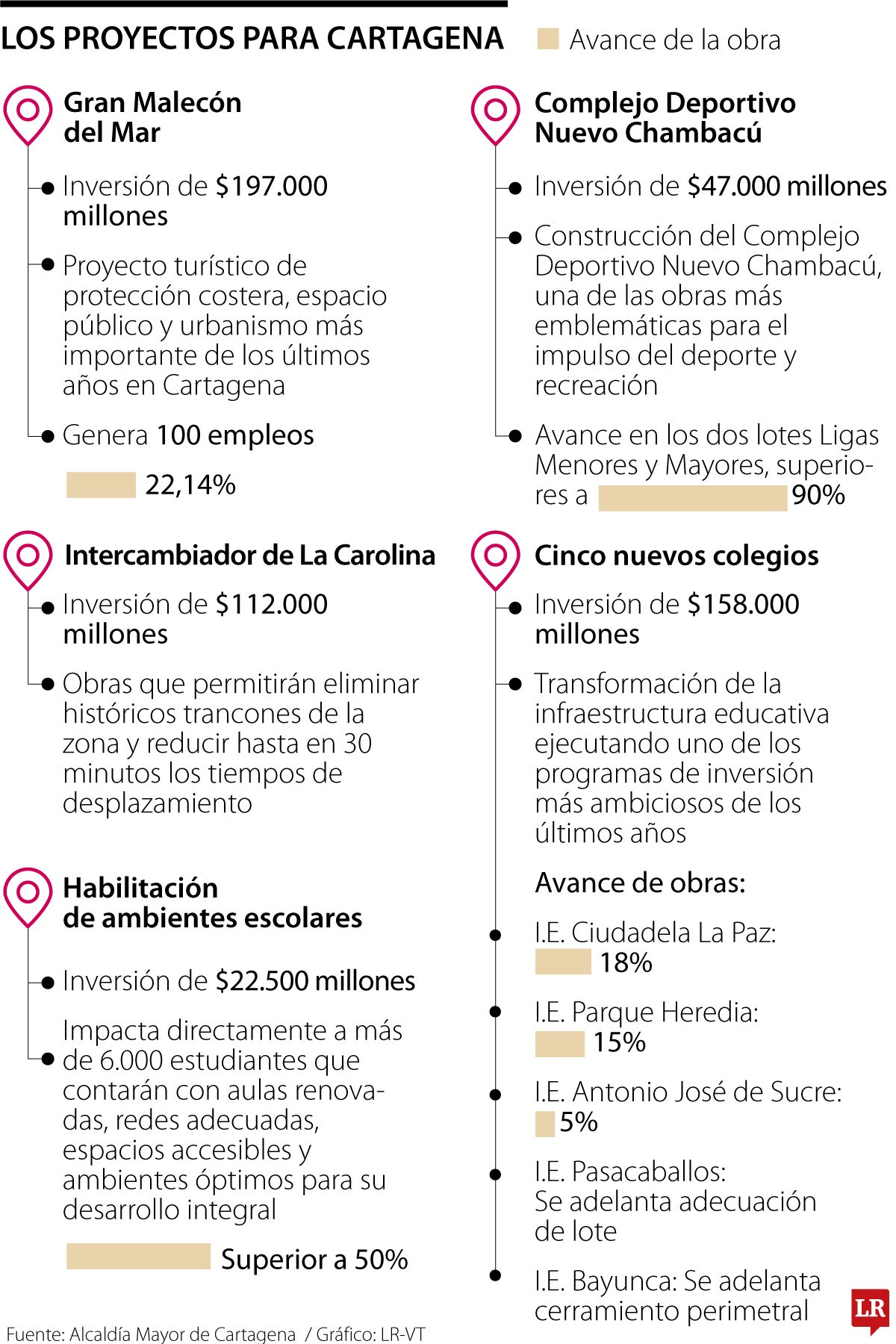 Según la administración actual, los proyectos en marcha rondan en una inversión que asciende a $536.500 millones, en las que se incluyen desarrollos como el Gran Malecón del Mar, uno de los más representativos, y la construcción de cinco nuevas Instituciones Educativas.