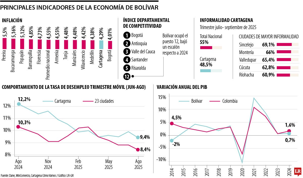 En el frente de los principales índices macroeconómicos, Cartagena ha presentado niveles de inflación y de desempleo inferiores al promedio nacional. Sobre el nivel de precios, la capital registró una variación año corrido IPC enero - septiembre 2025 de 4,29%. Lo que quiere decir que se ubicó 0,26 puntos porcentuales por debajo del promedio nacional para ese periodo. Los rubros que jalonaron más los precios en los primeros nueve meses del año son Educación (9,1%), Transporte (8,8%) y el sector de Restaurantes (6,7%).