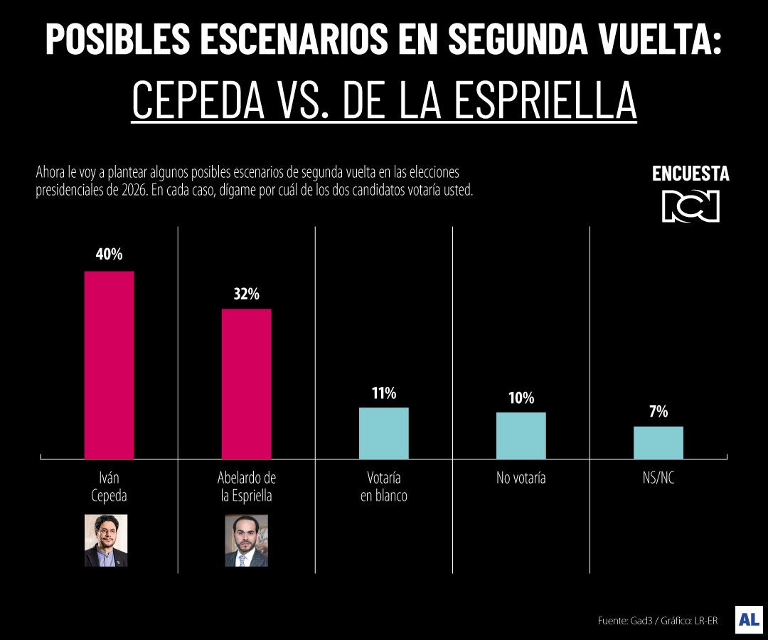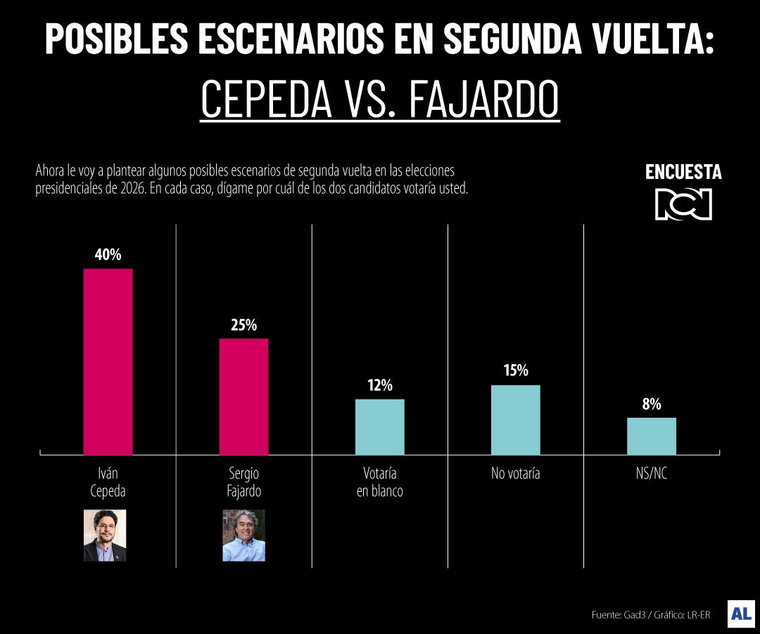 La encuesta también reveló cuáles son las posibles combinaciones para la segunda vuelta; Cepeda también se posiciona como uno de los grandes favoritos. Se encontró que el candidato de la izquierda tendría una intención de voto de 40% frente a 32% para De la Espriella. Asimismo, podría esperarse un enfrentamiento entre Cepeda y Sergio Fajardo, con una preferencia electoral del 40% y 25%, respectivamente.