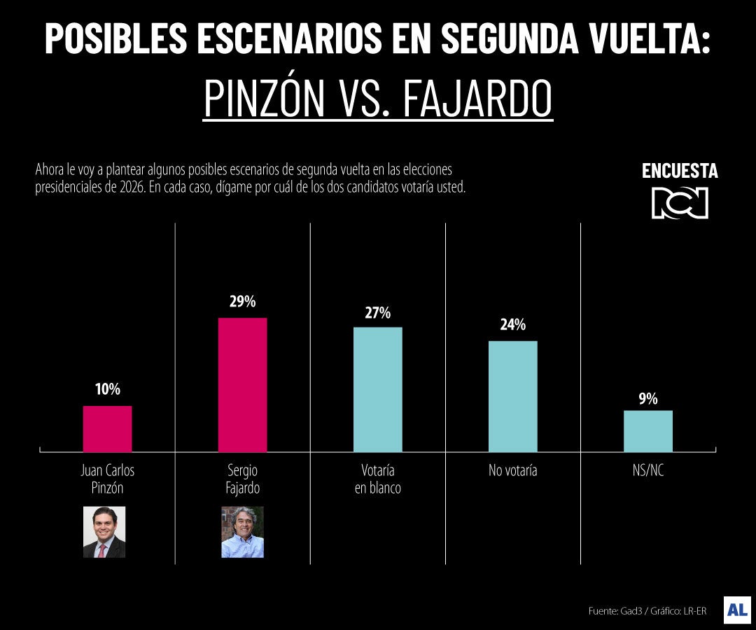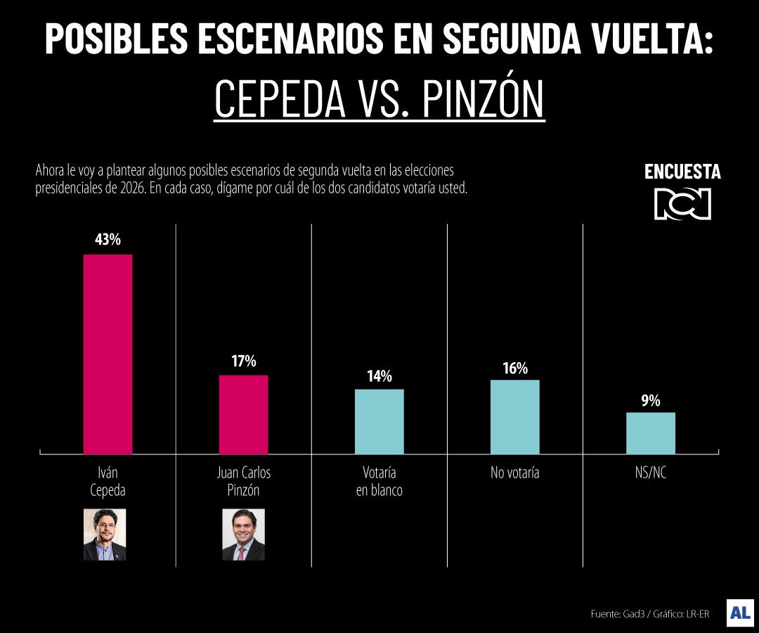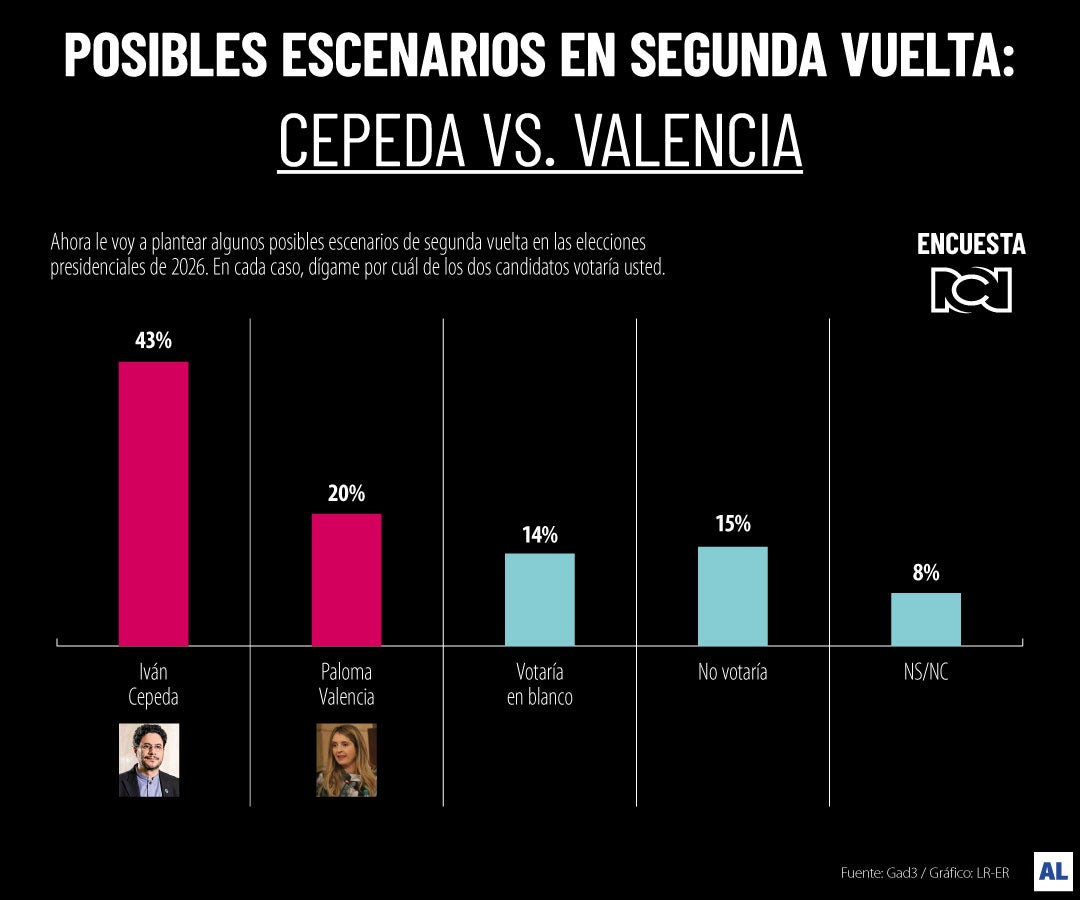 Cepeda y Paloma Valencia podrían también entrar a competir en la segunda tanda por las presidenciales, con 43% y 20% de los sufragios. El candidato de la izquierda, además, podría llegar a las urnas en la segunda vuelta contra Juan Carlos Pinzón, con una proporción de papeletas de 43% y 17%. Otros posibles escenarios enfrentarían a De la Espriella (32%) contra Fajardo (19%); Pinzón (10%) contra Fajardo (29%); y Paloma (17%) contra Fajardo (28%).